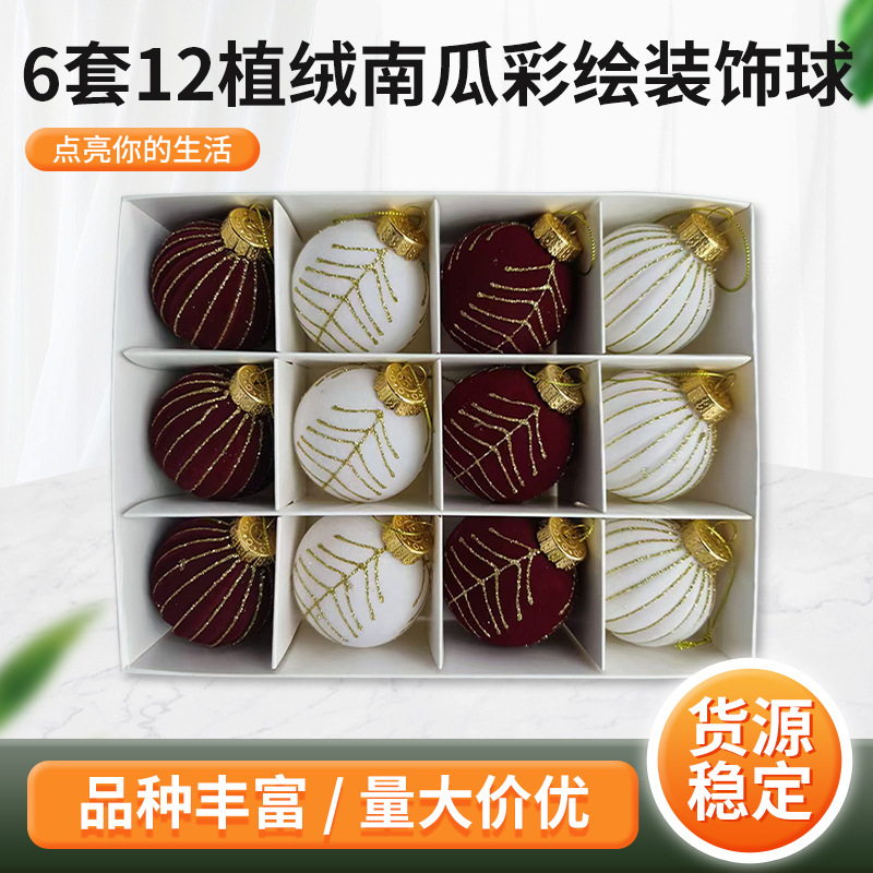 12个6cm植绒南瓜彩绘装饰球套装圣诞节场景布置节日装饰吊球批发