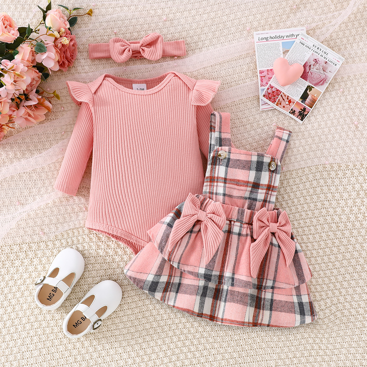 女婴甜美可爱小飞袖长袖哈衣 格子背带裙+长袖上衣+蝴蝶结发带