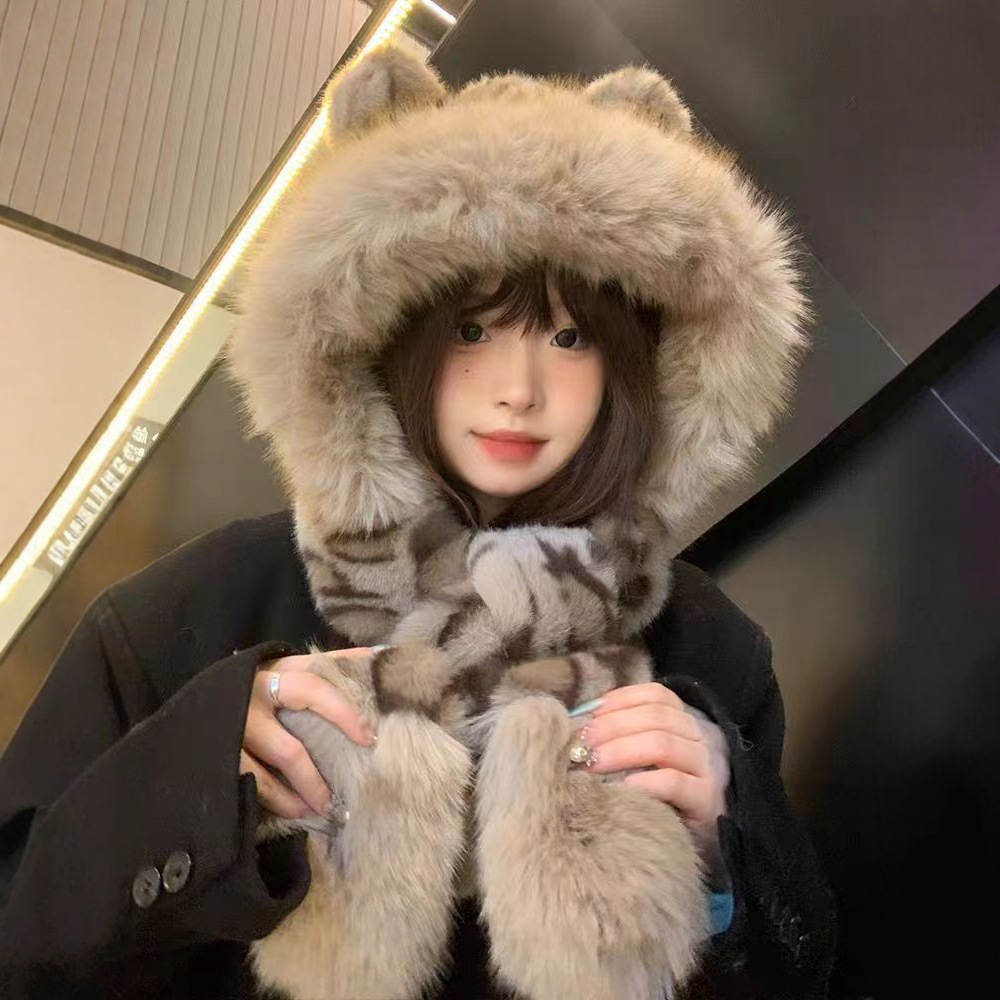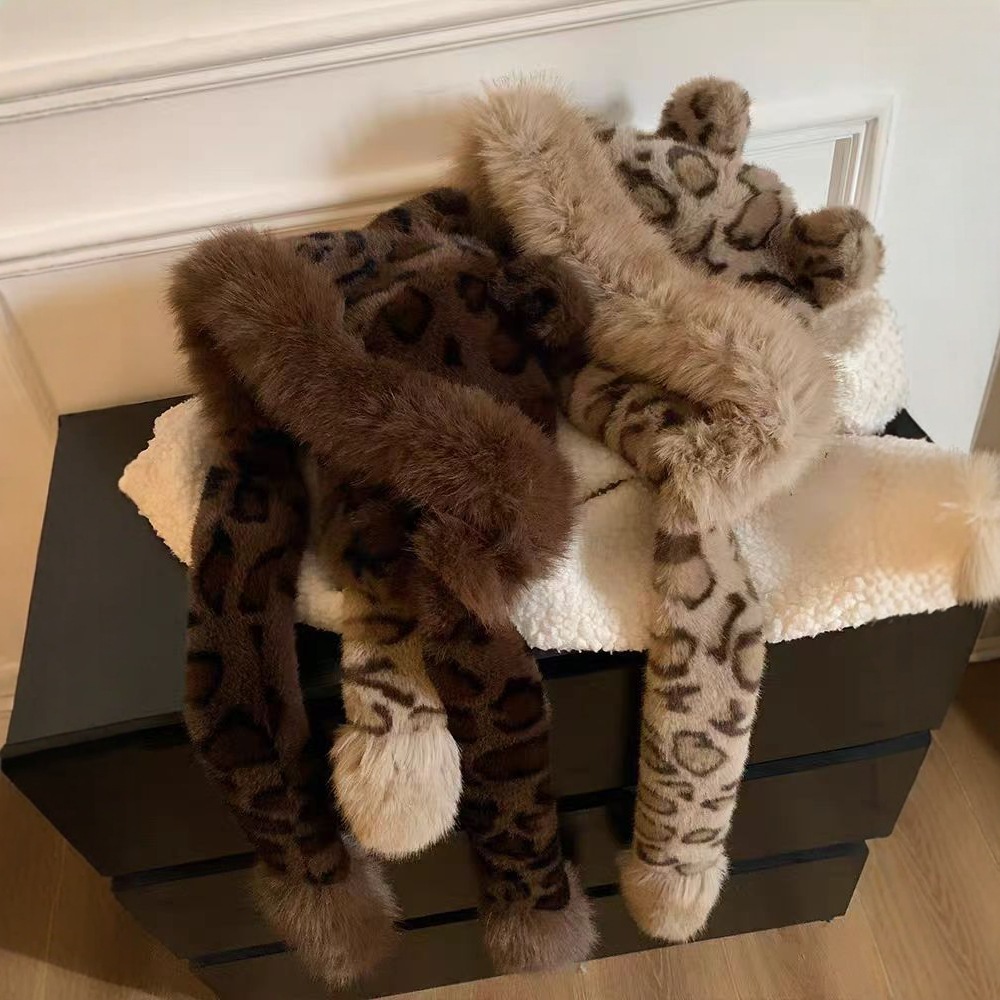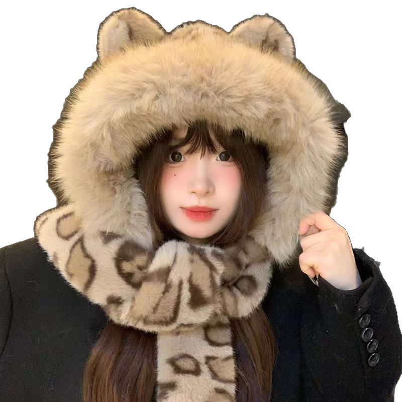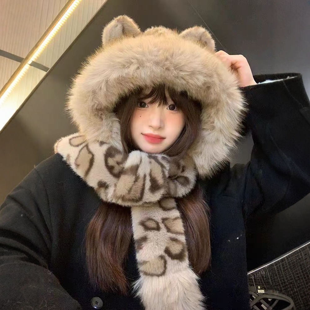 小熊耳朵豹纹毛绒帽女2025年冬季帽子围巾一体加厚保暖护耳雷锋帽