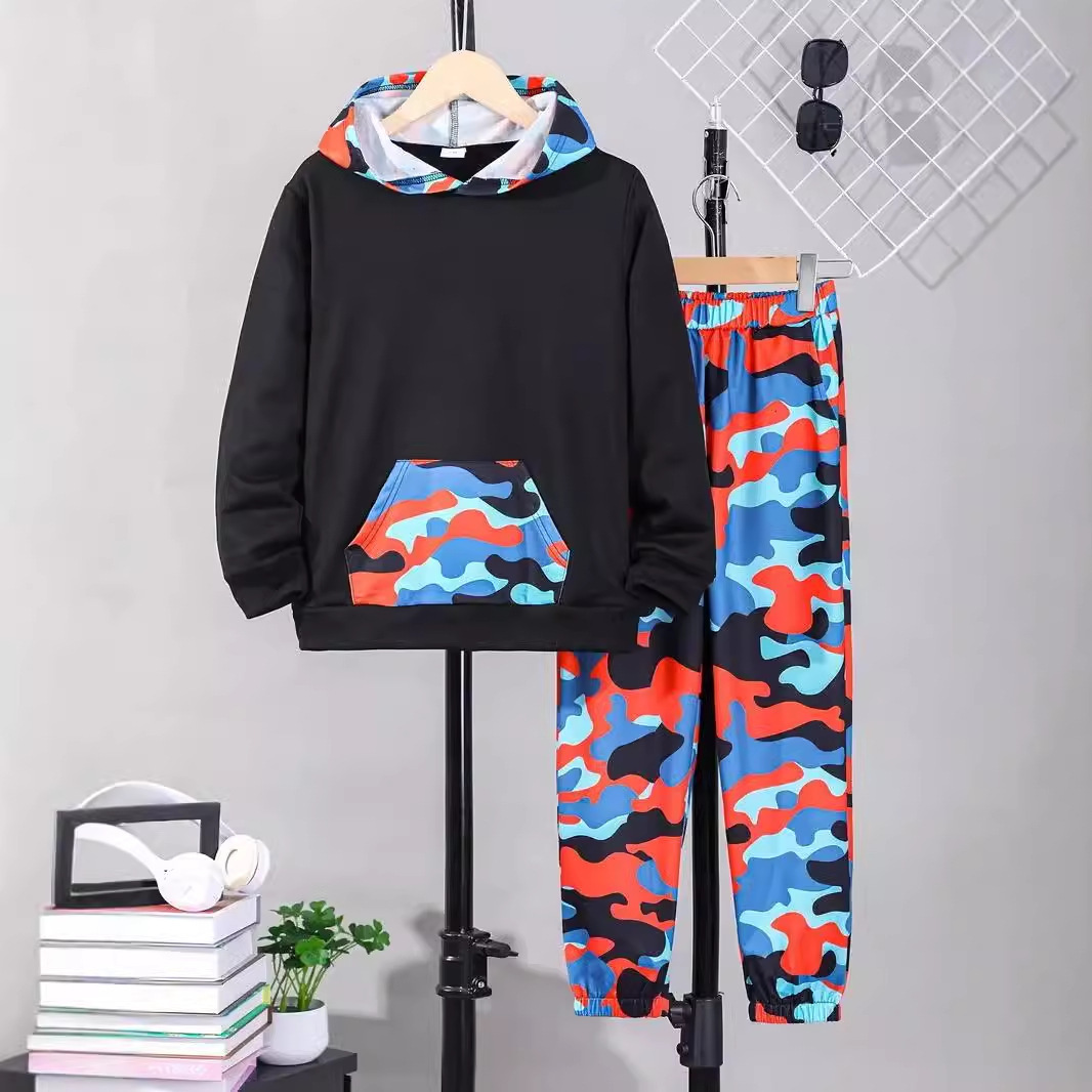 跨境新款男童两件套秋季3d印花儿童男孩连帽长袖长裤卫衣帅气套装
