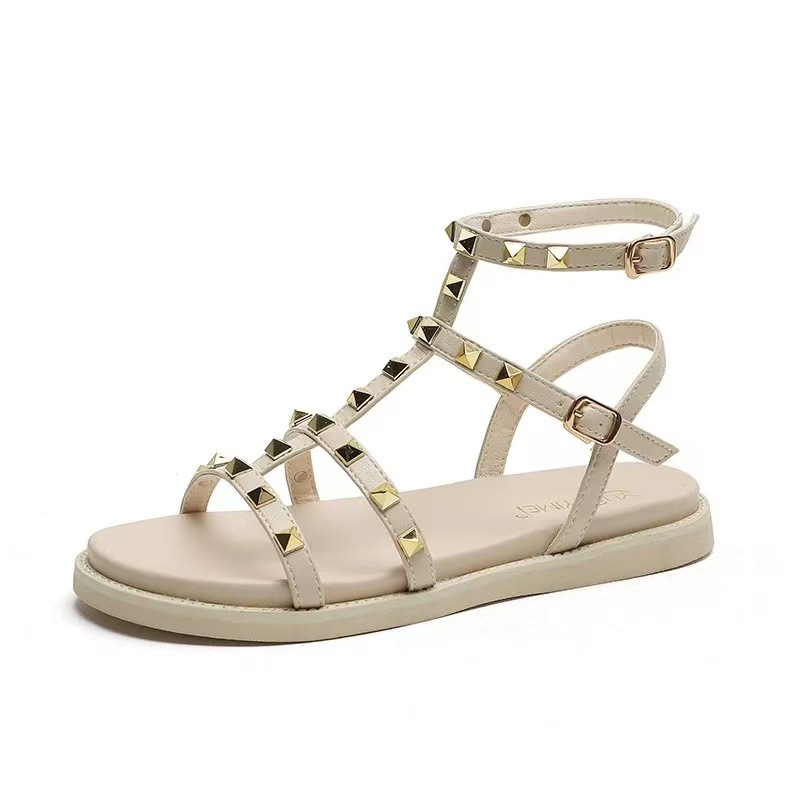 铆钉时装凉鞋新款一字带仙女风罗马鞋法式平底尖头舒适时尚拖鞋