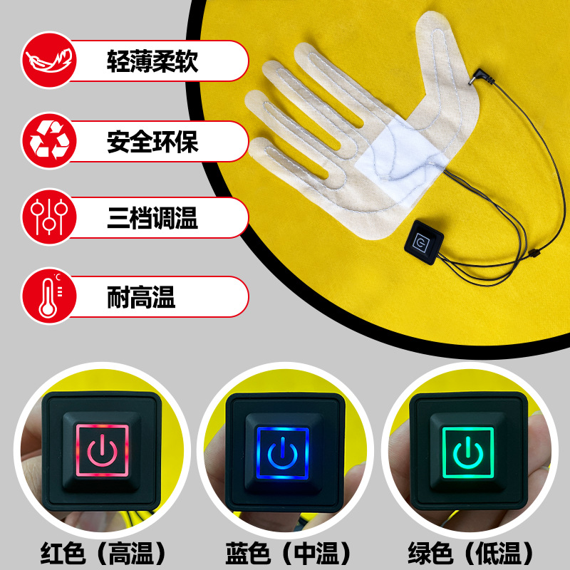 适用于冬季户外分指手套、滑雪手套等,实现五指独立三档调温,兼顾手部灵活性与保暖性。