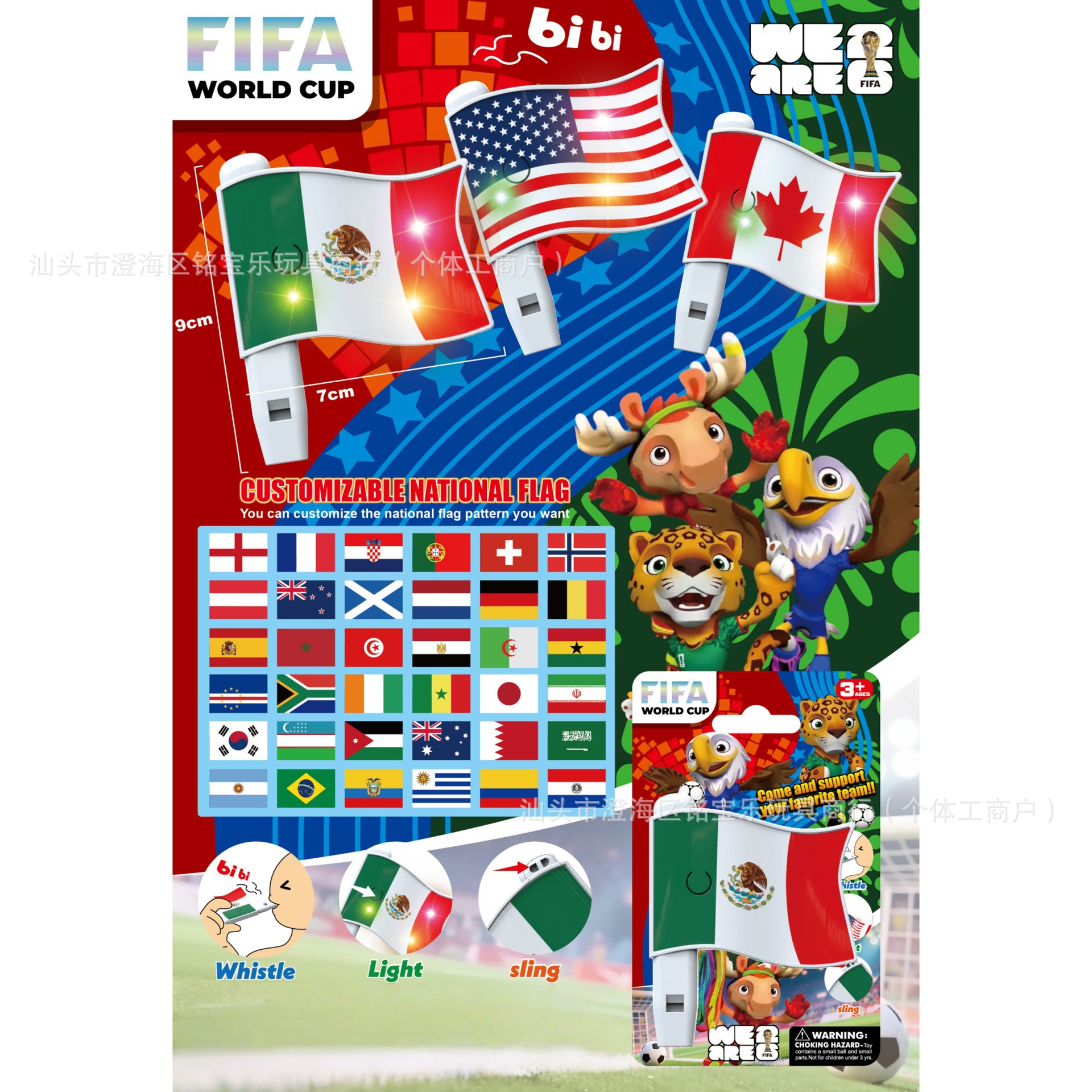 | 颜色 | 吉祥物闪光口哨(OPP袋)三款混装/箱1200只MBL001626 | 颜色 | 美加墨世界杯闪光国旗口哨(板装)多款混装/箱720板MBL001627 |