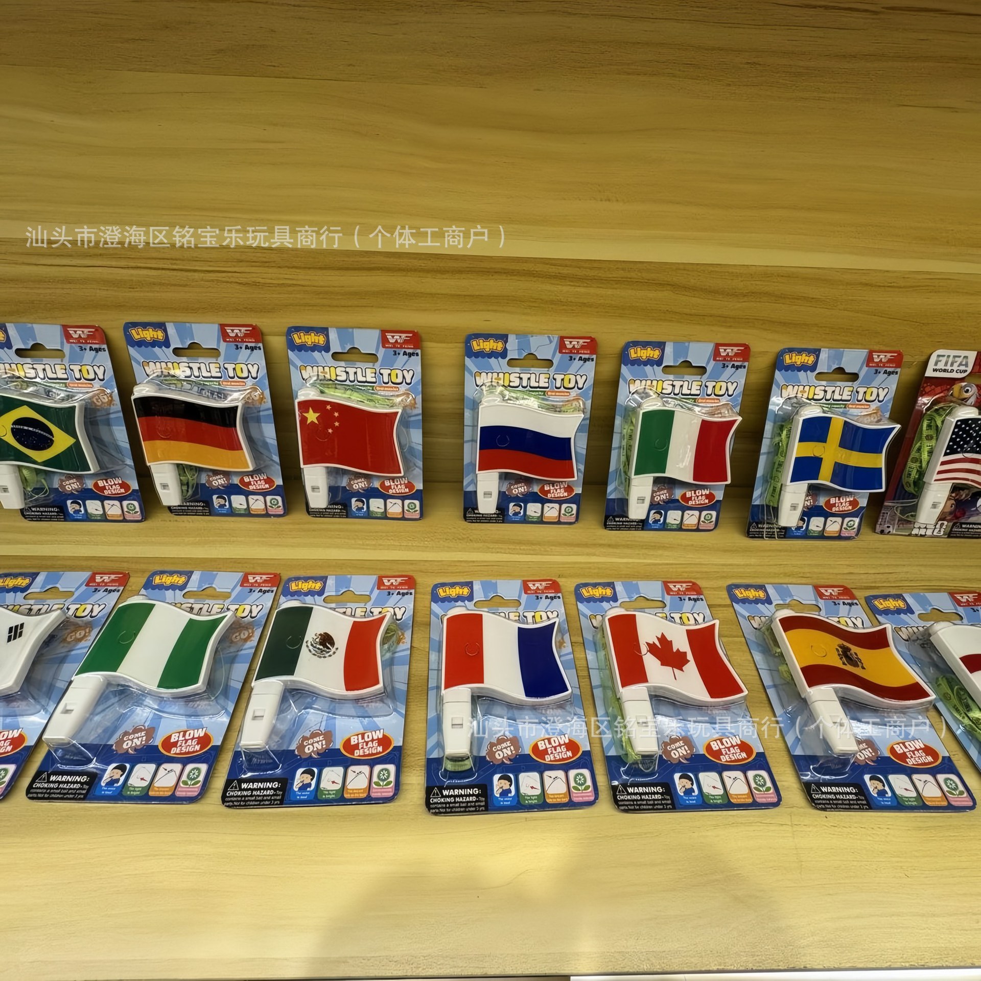 | 颜色 | 美加墨世界杯闪光国旗口哨(OPP袋)多款混装/箱1200只MBL001628 | 颜色 | 世界各国闪光国旗口哨(板装)多款混装/箱720板MBL001629 |