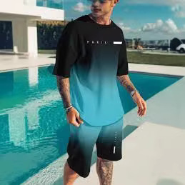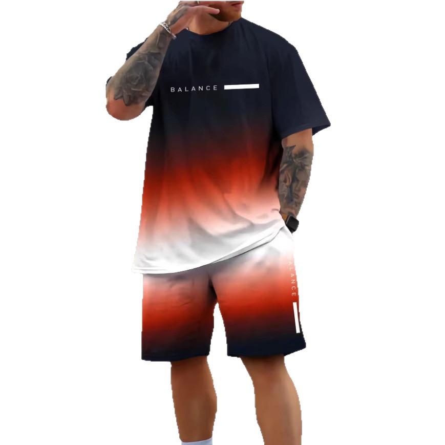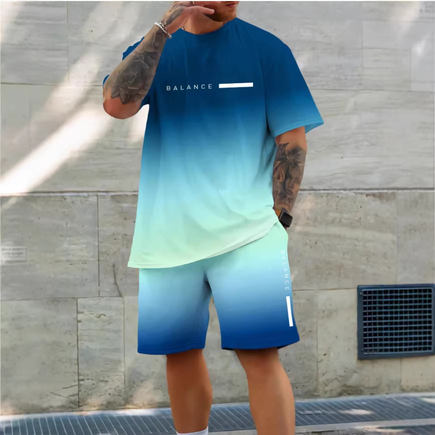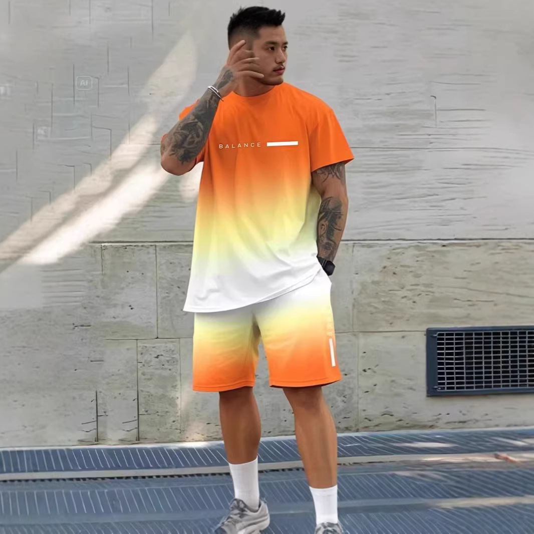 2025夏新款休闲运动短袖T恤男夏季新款 渐变 字母圆领T恤短裤套装