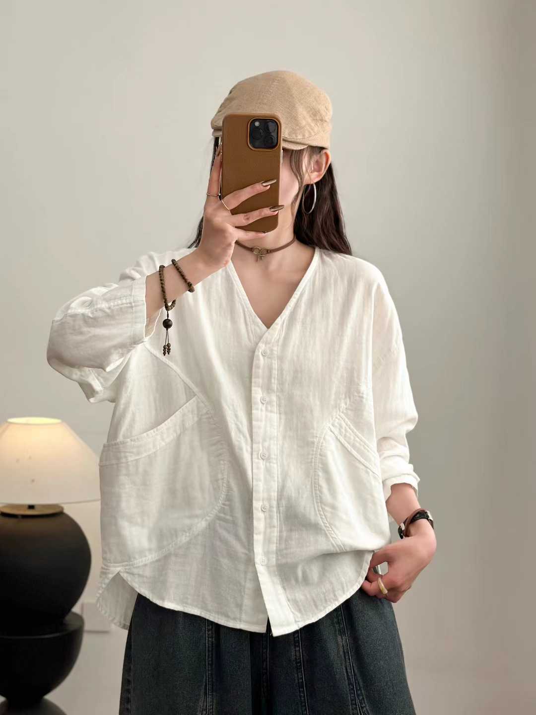 双层棉纱衬衫 2026春季新款 V领不规则纯色小个子休闲宽松衬衣女