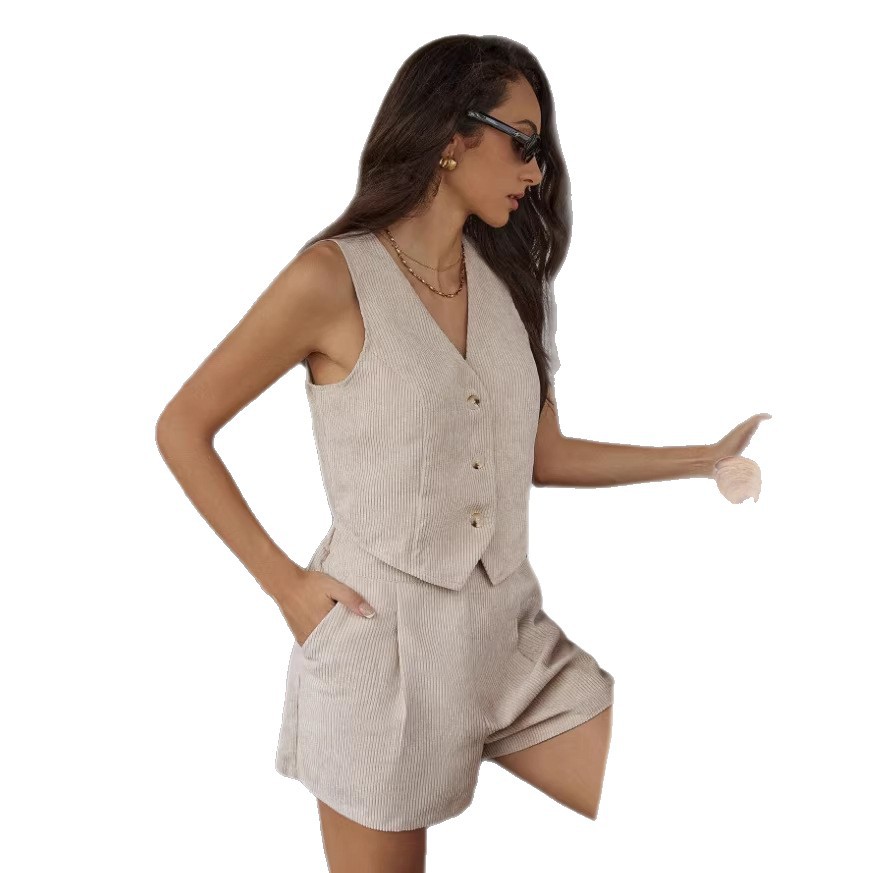 欧美外贸亚马逊春秋新款女休闲条纹V领纽扣背心短裤口袋度假套装