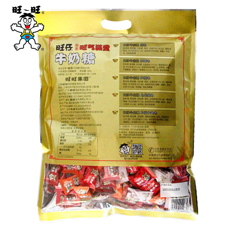 | 包装规格 | 旺仔牛奶糖480g(约120颗)-混合口味 | 包装规格 | 旺仔牛奶糖500g(约150颗)原味 |