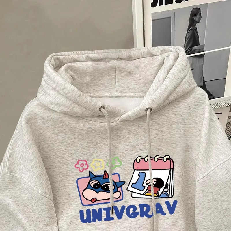 卡通蜡笔小新印花秋冬新款成人连帽卫衣加绒加厚外套上衣白灰欧美