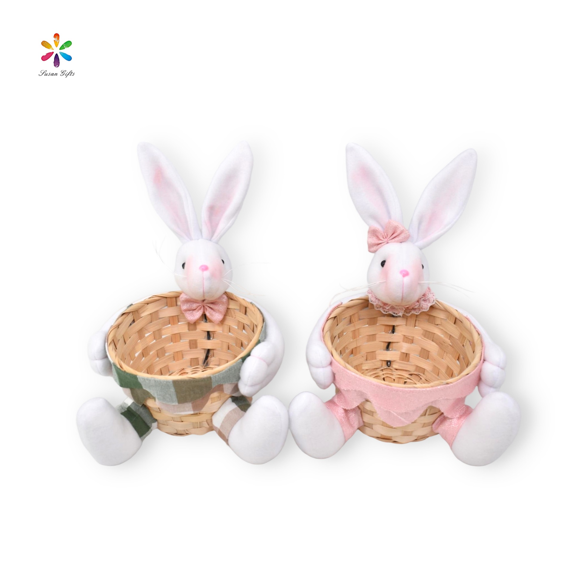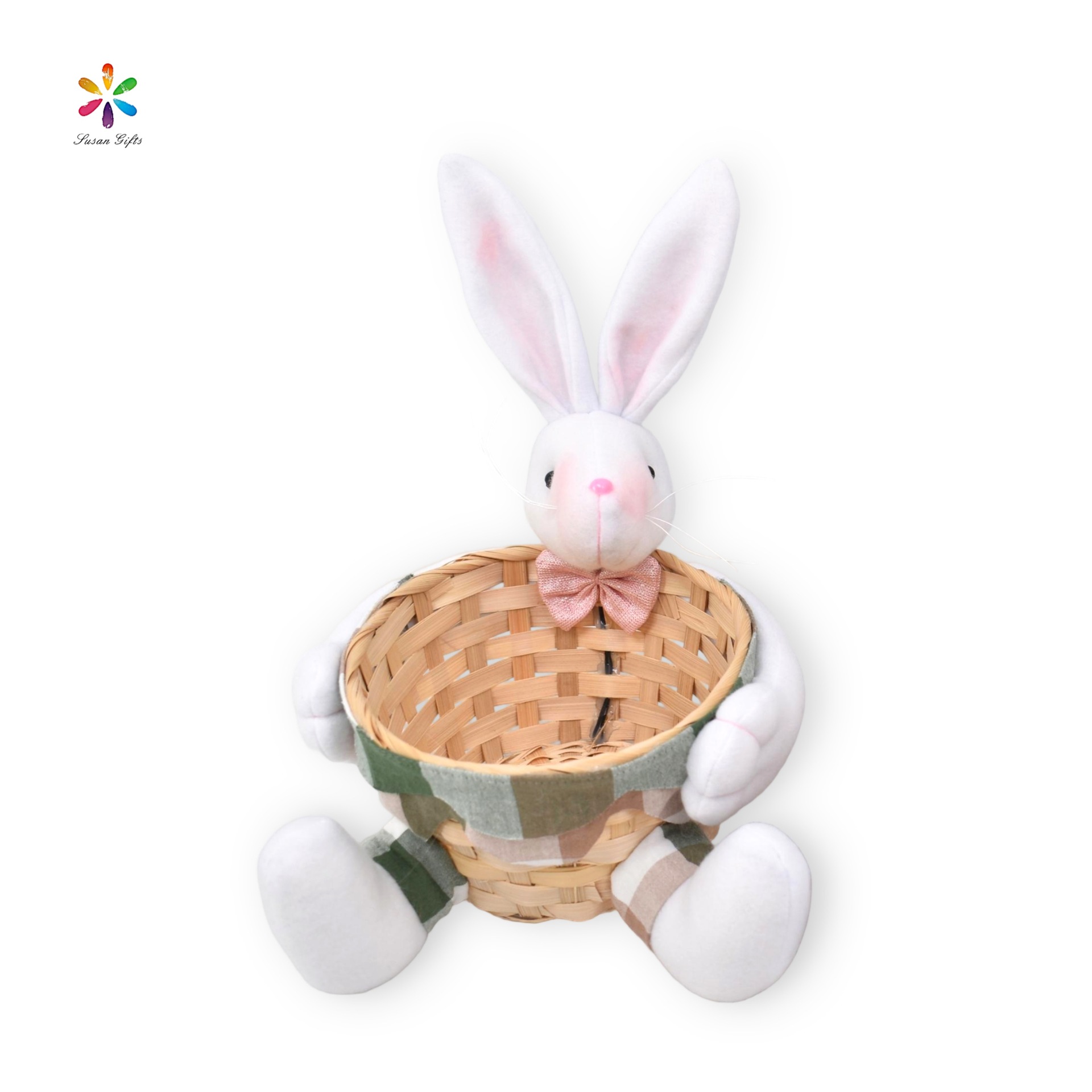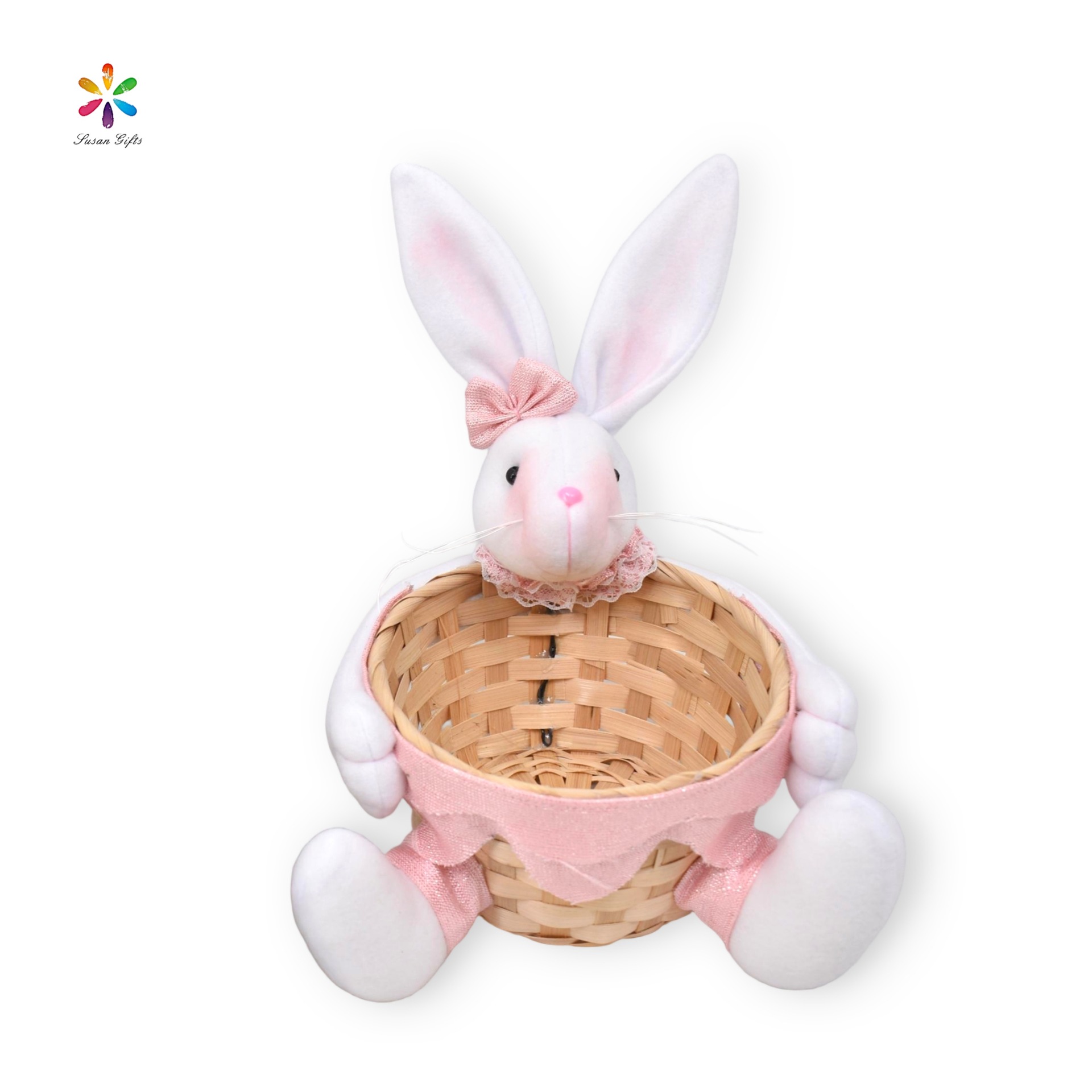 卡通可爱白色粉蝴蝶结兔子复活节家居摆件抱着竹篮复活节彩蛋挂件