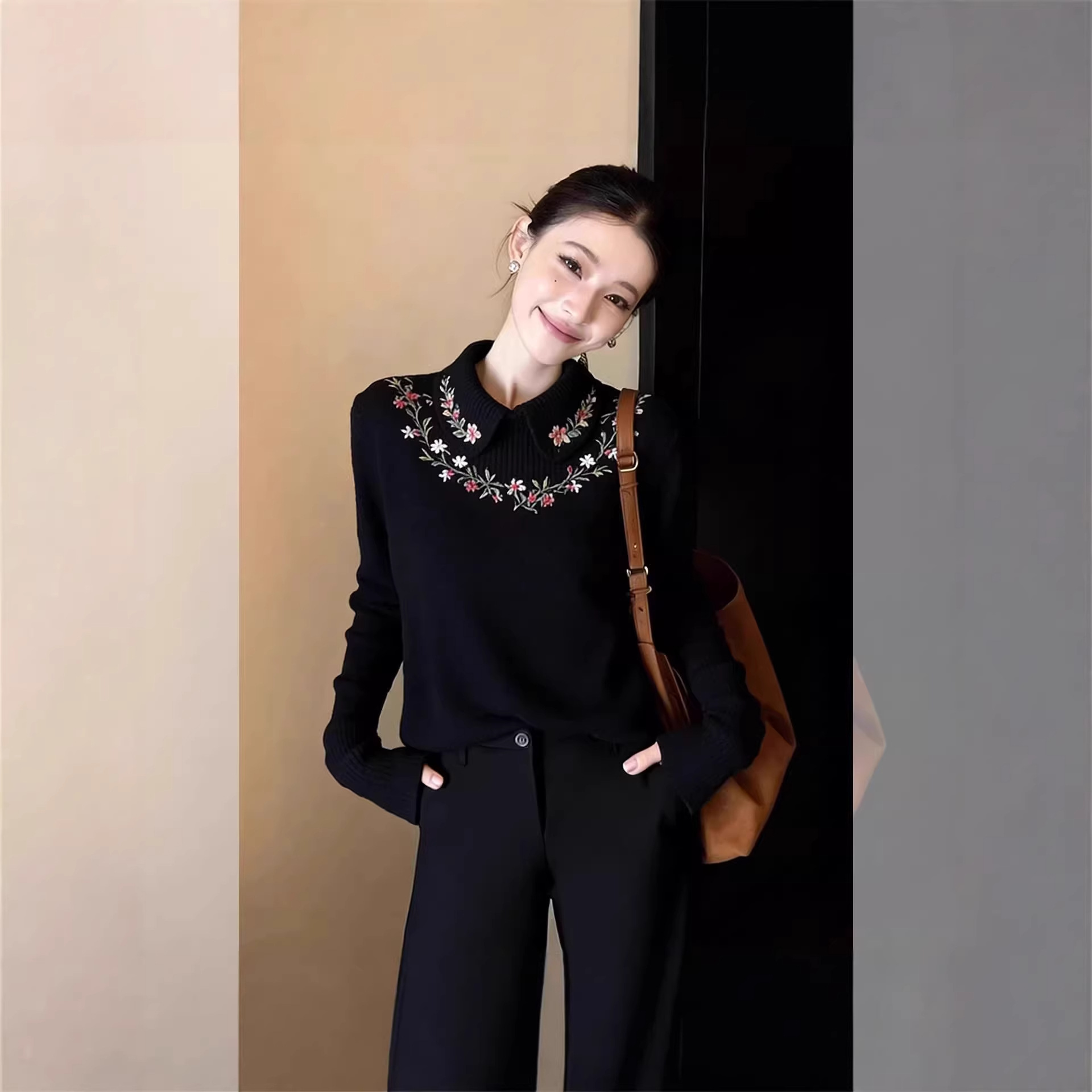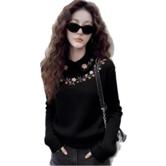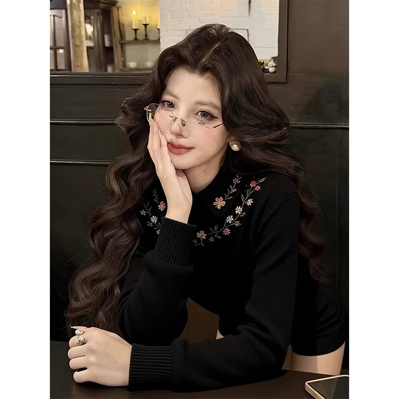 花朵刺绣黑色打底长袖T恤女2026新款冬季翻领可外穿内搭宽松型