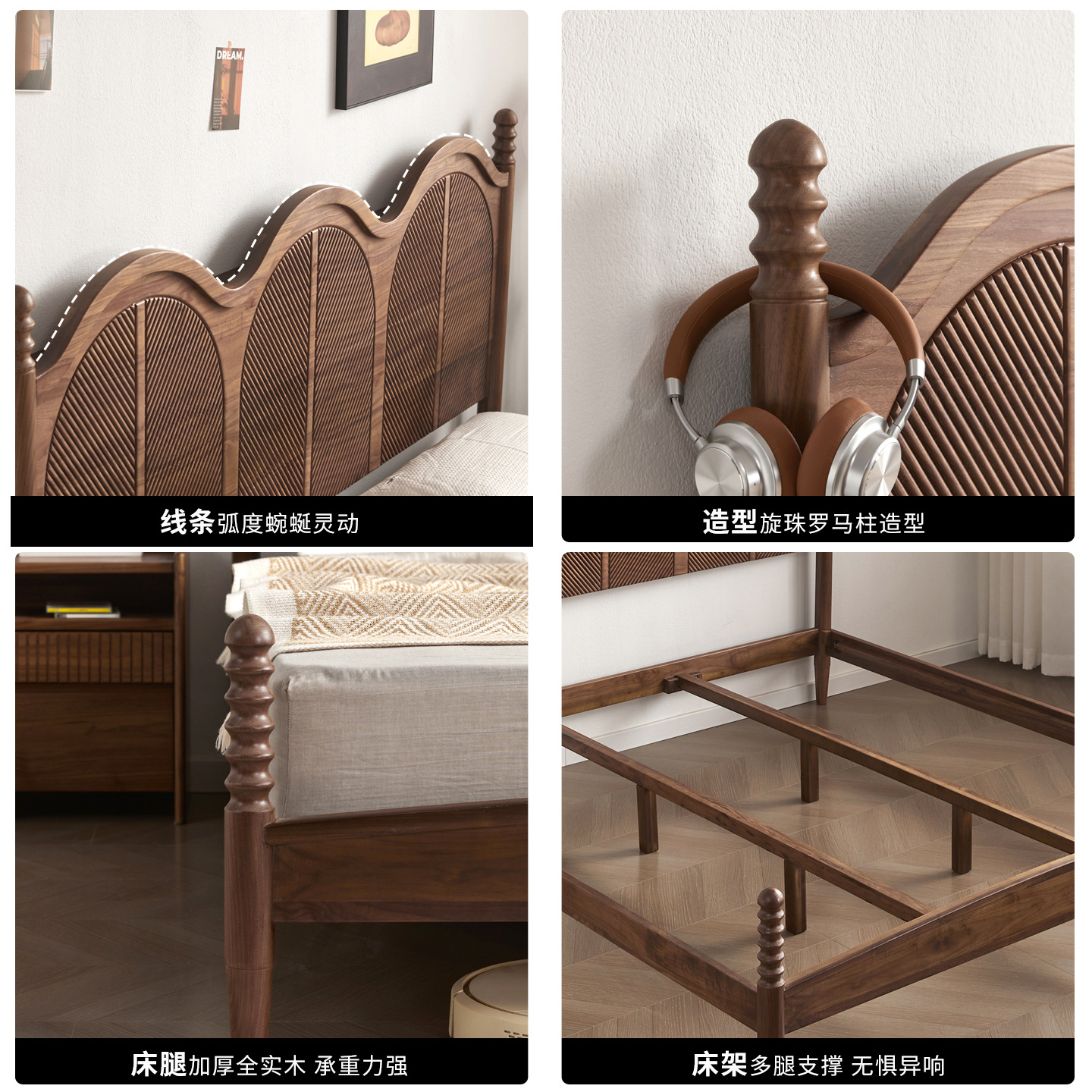法式复古实木床黑胡桃木1.8米双人床简约中古风1.5米轻奢主卧大床