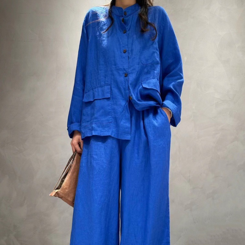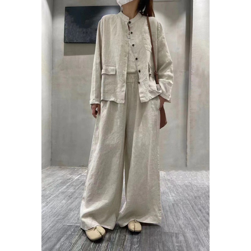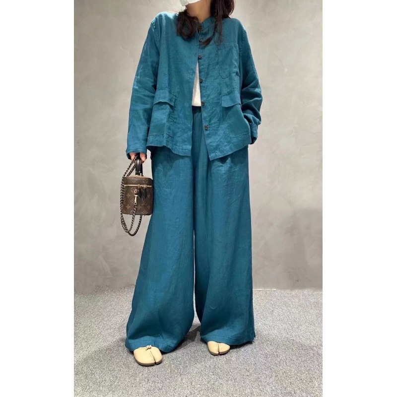 cz9102+8998纯色亚麻衬衣+休闲裤文艺气质宽松百搭显瘦两件套装女