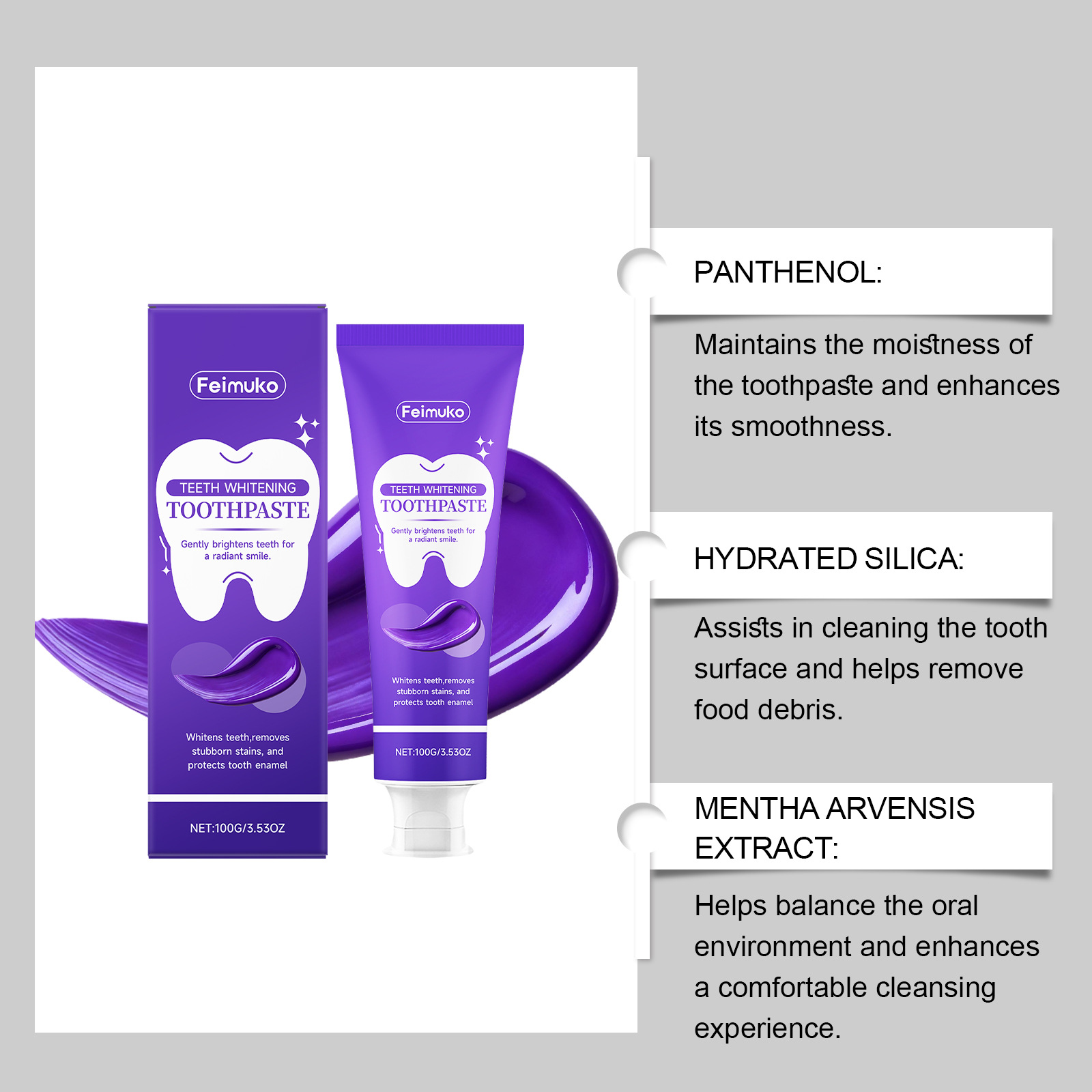 Feimuko 紫色牙膏 温和成分清新口气日常清洁牙齿口腔洁净护理