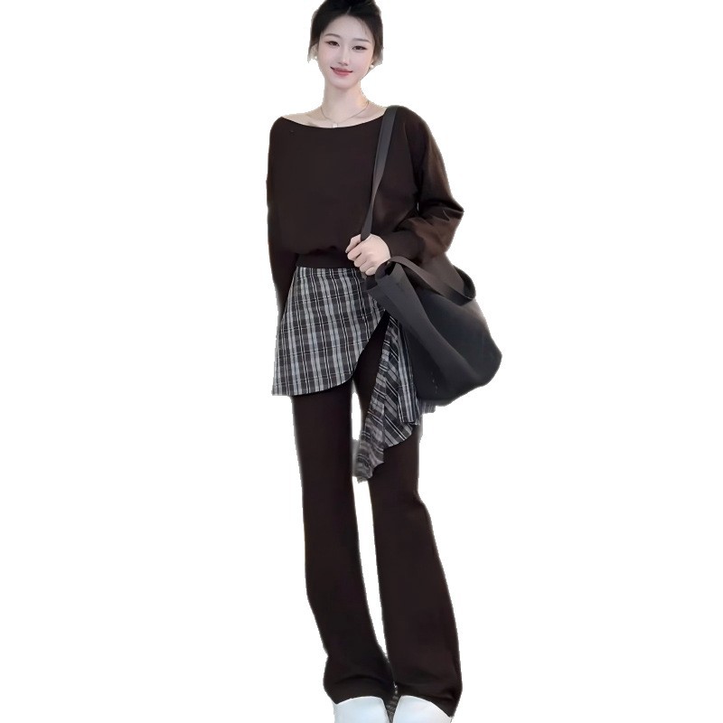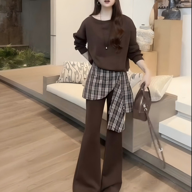 2026秋新圆领宽松斜肩女拼接格子微喇裤女士时尚套装