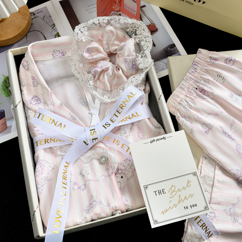 小红书推荐kitty少女冰丝睡衣女蕾丝花边长袖长裤套装家居服批发