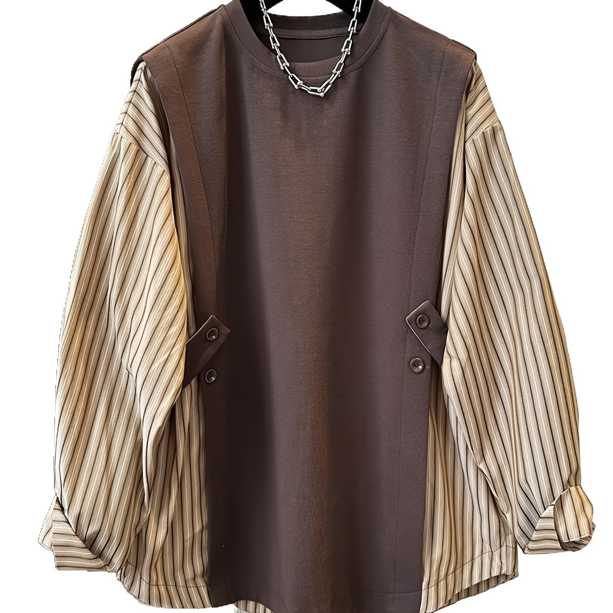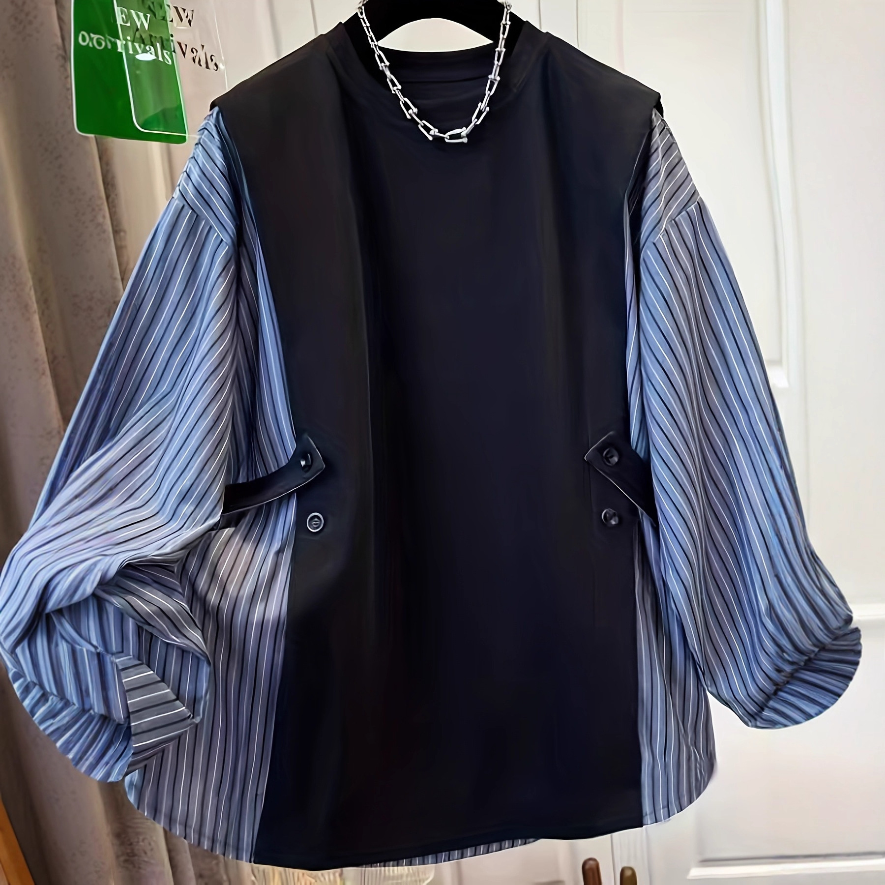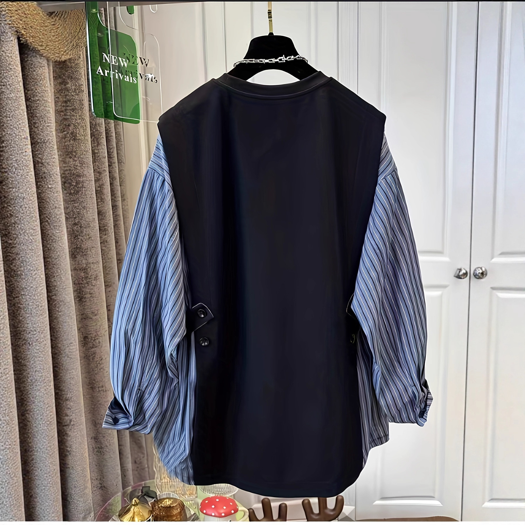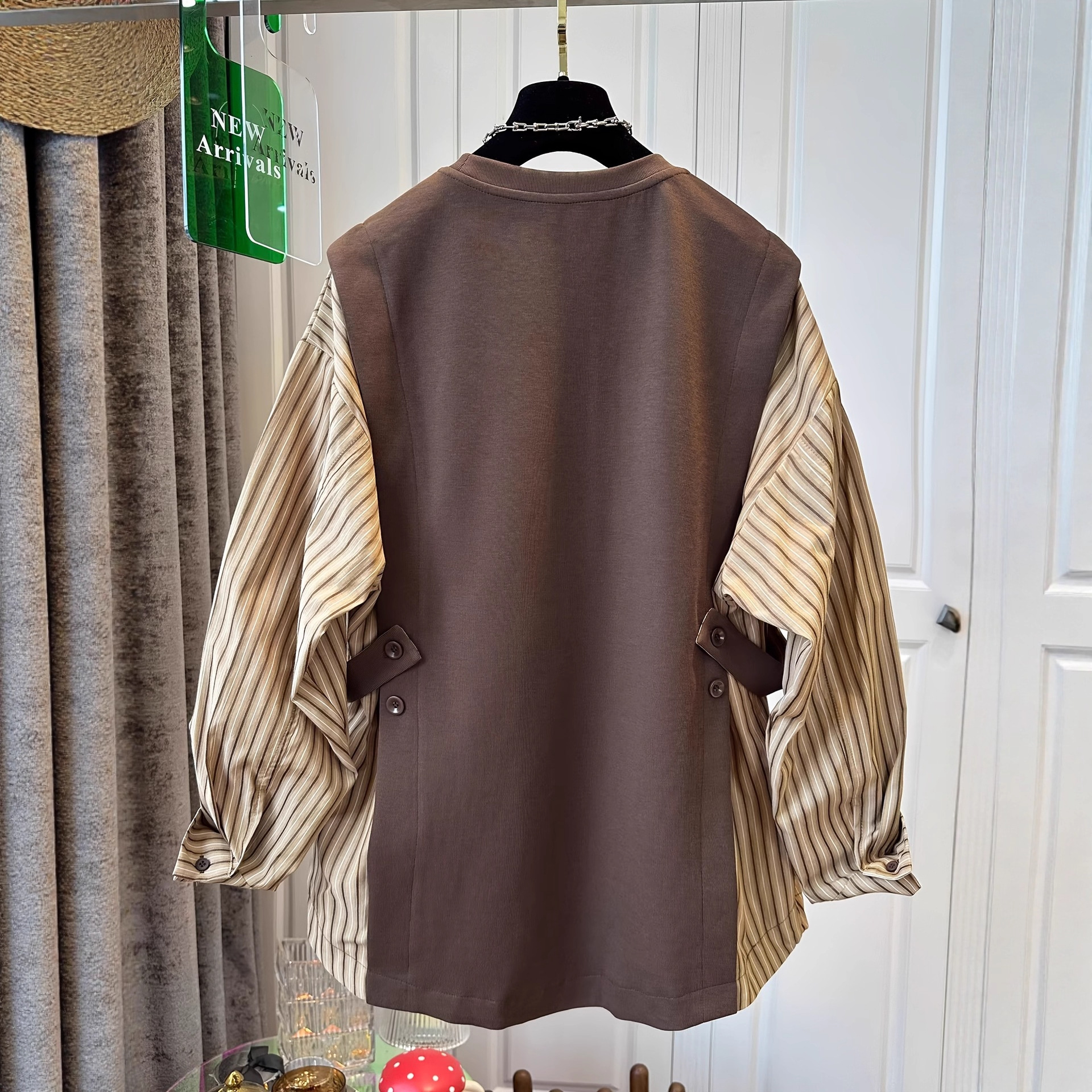 2026新款春秋大码显瘦设计感假两件女拼色条纹T恤圆领长袖上衣