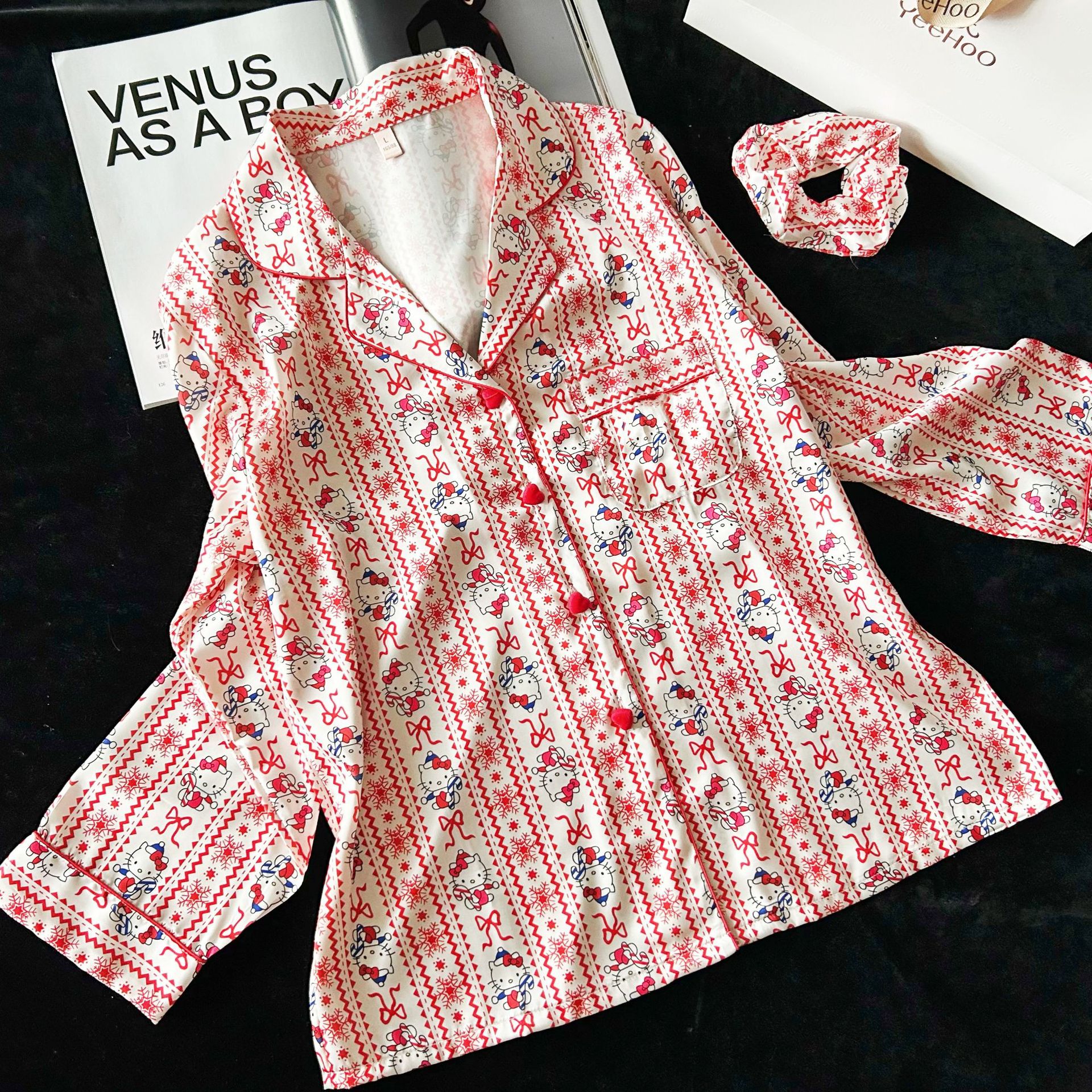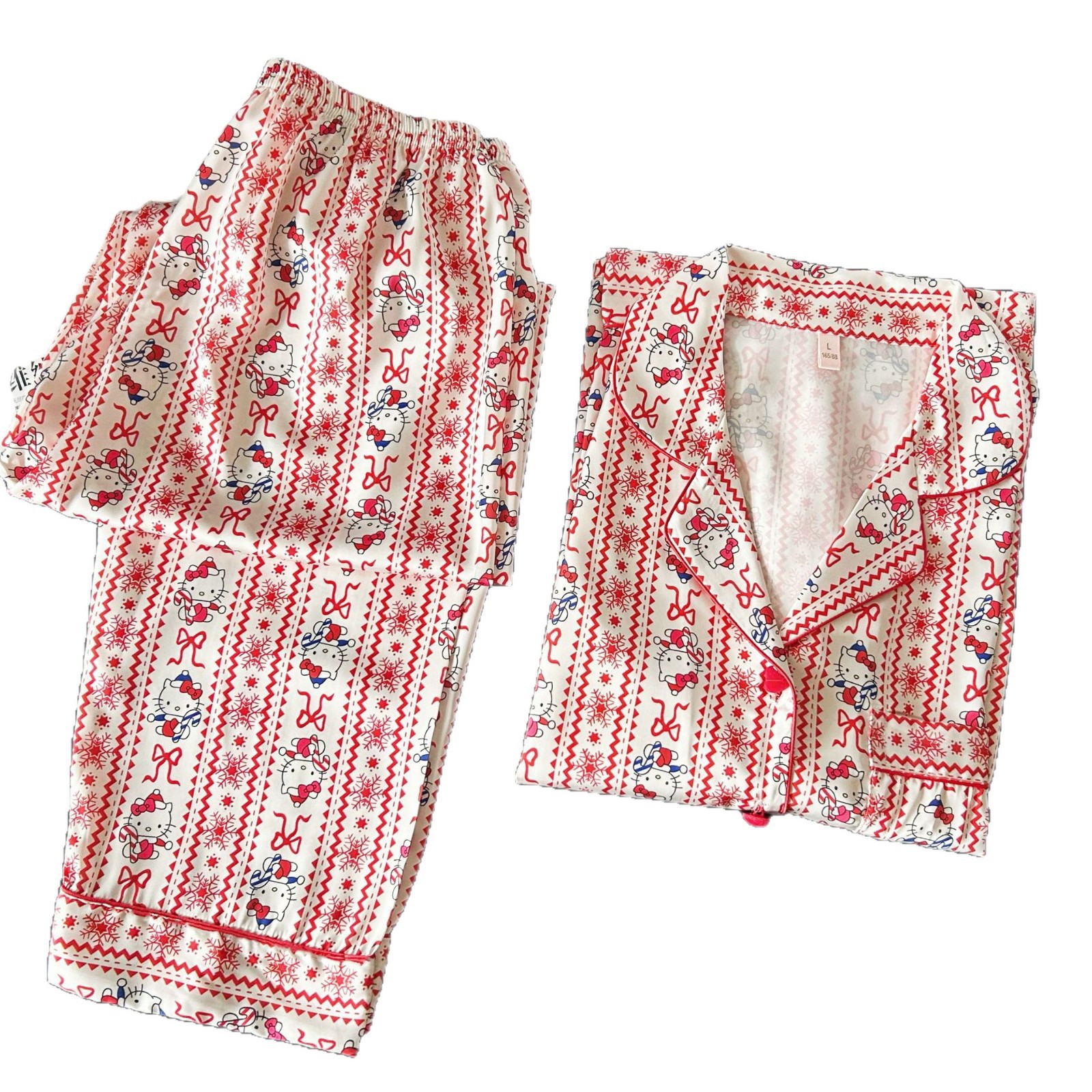 红色KT猫可爱卡通冰丝睡衣女高级感新年红长袖长裤套装家居服批发