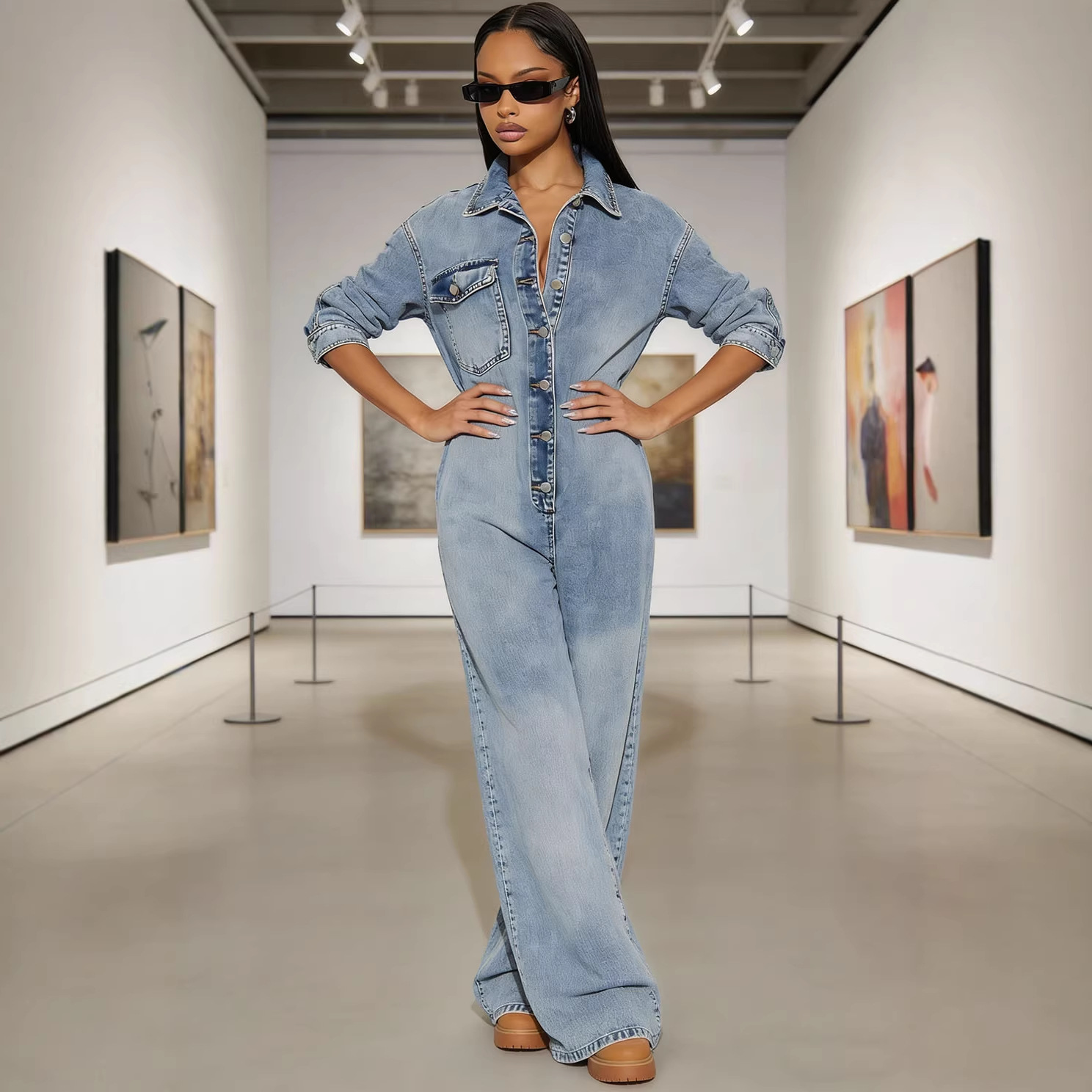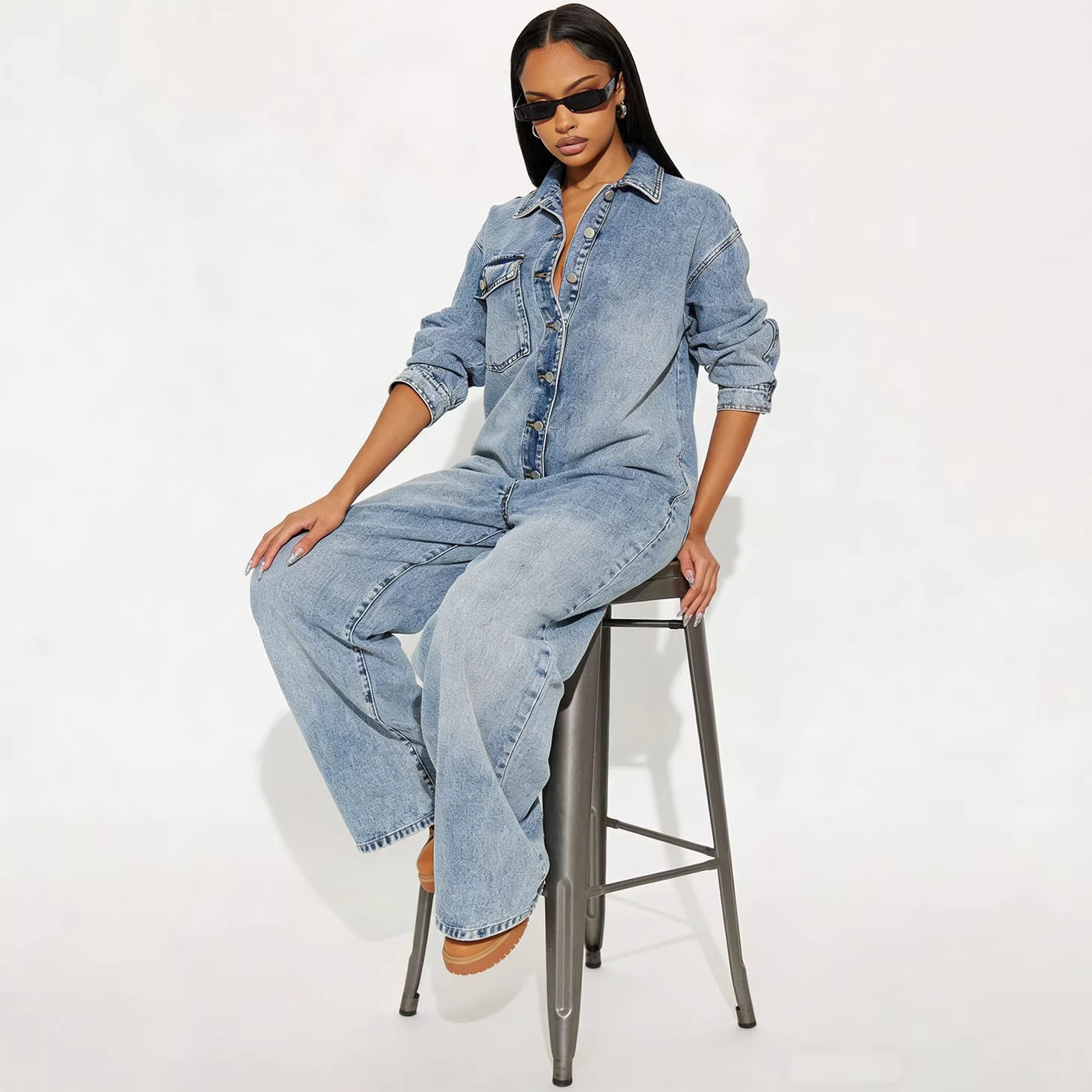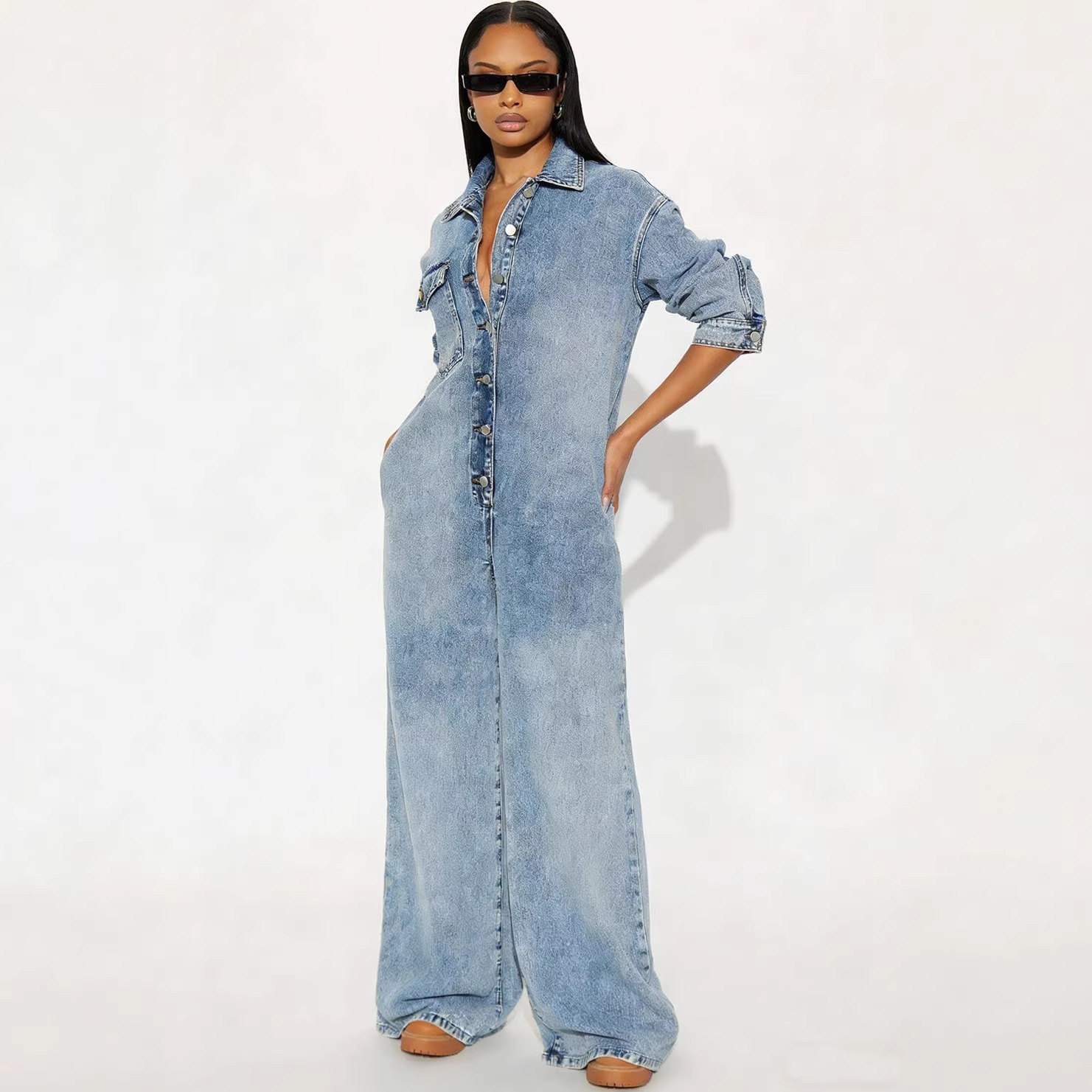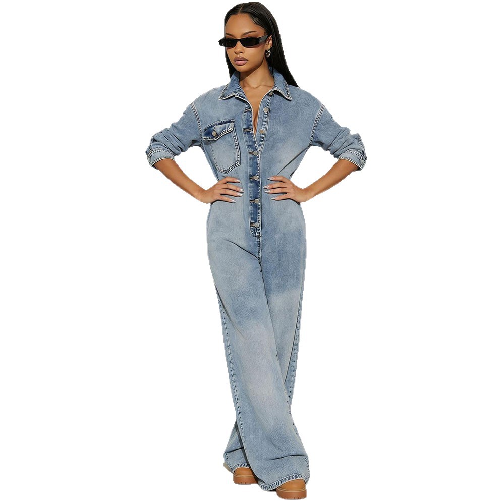欧美跨境女装亚马逊女式牛仔连身裤2026年新款纽扣前襟长袖连体衣