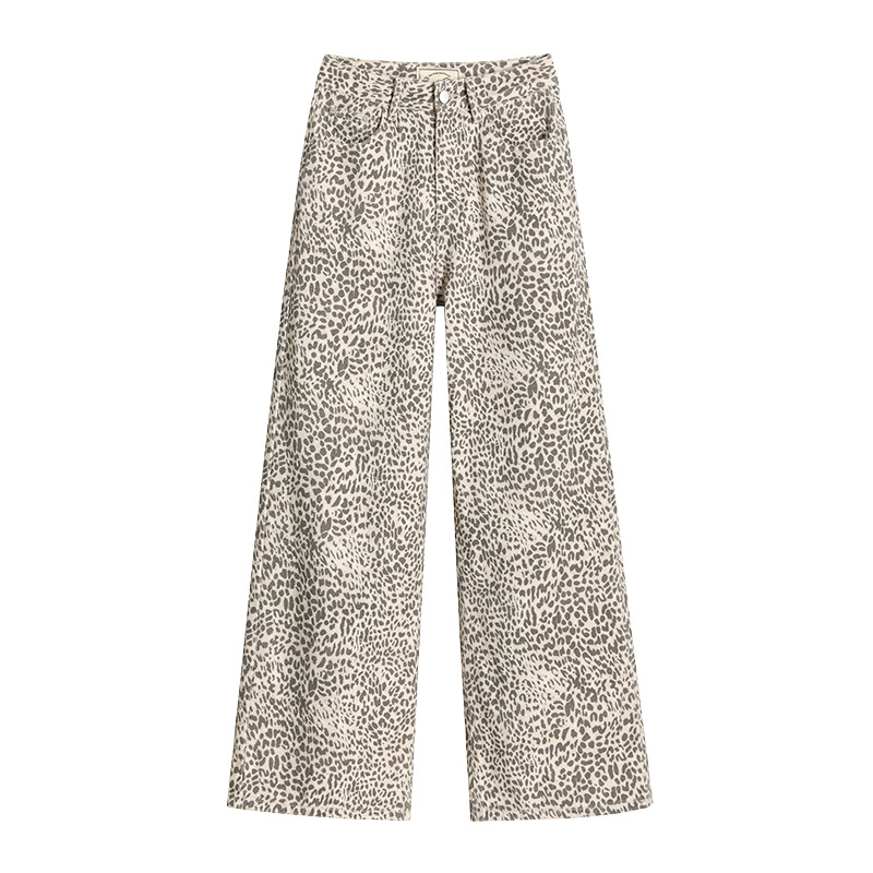 2026春季新款豹纹牛仔长裤女美式高腰宽松休闲百搭直筒阔腿拖地裤