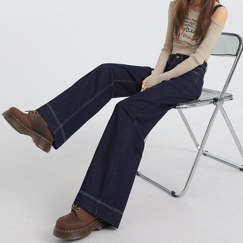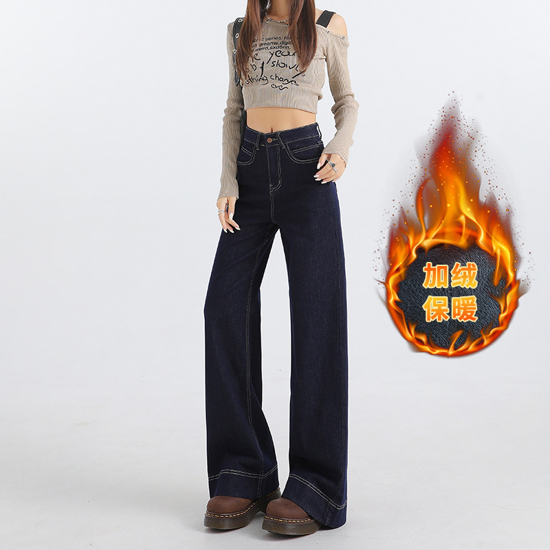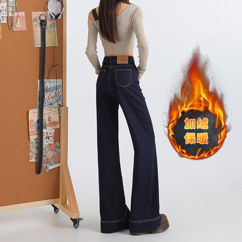 2025年冬季加绒加厚牛仔长裤女美式高腰丹宁蓝宽松百搭阔腿喇叭裤