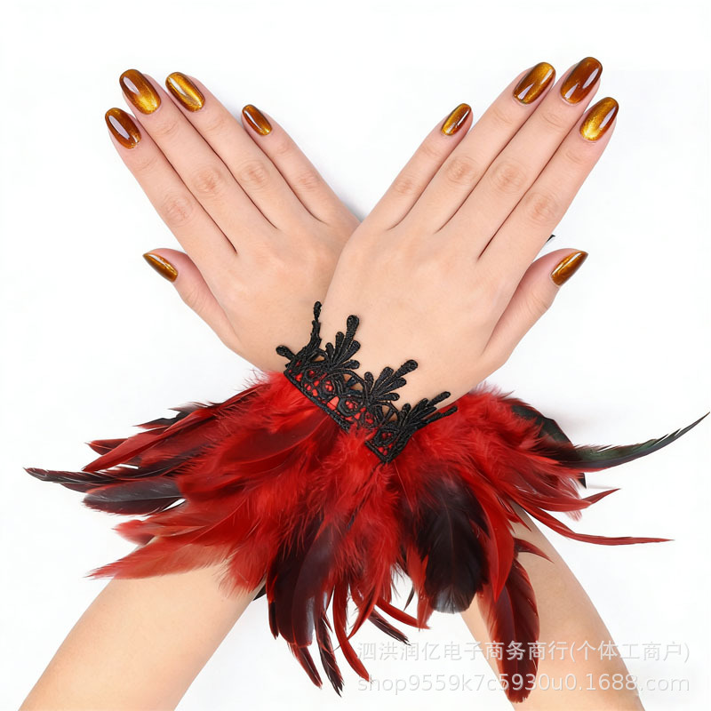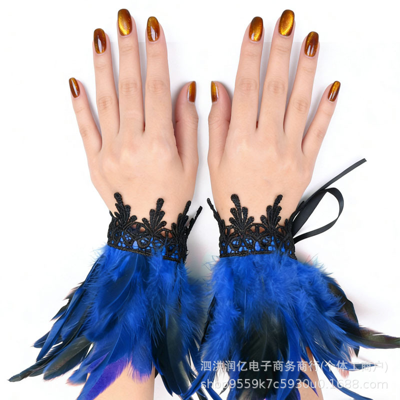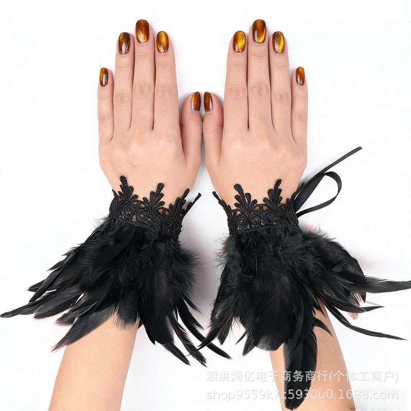 欧美万圣节羽毛手环哥特风格蕾丝花边羽毛腕带表演舞会假袖口跨境