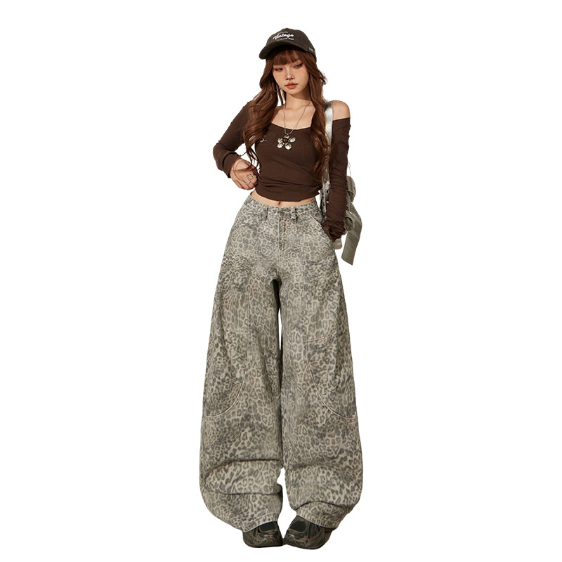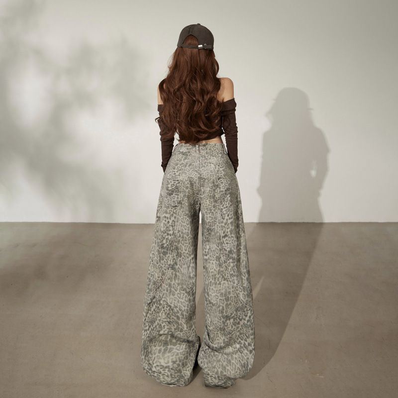 美式复古高腰宽松阔腿裤豹纹弯刀裤百搭2025秋冬垂感镰刀牛仔裤女