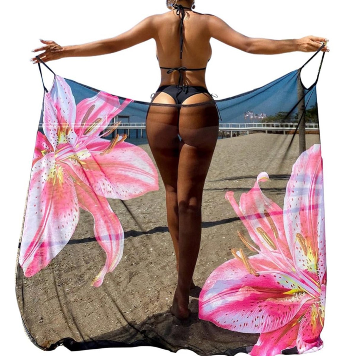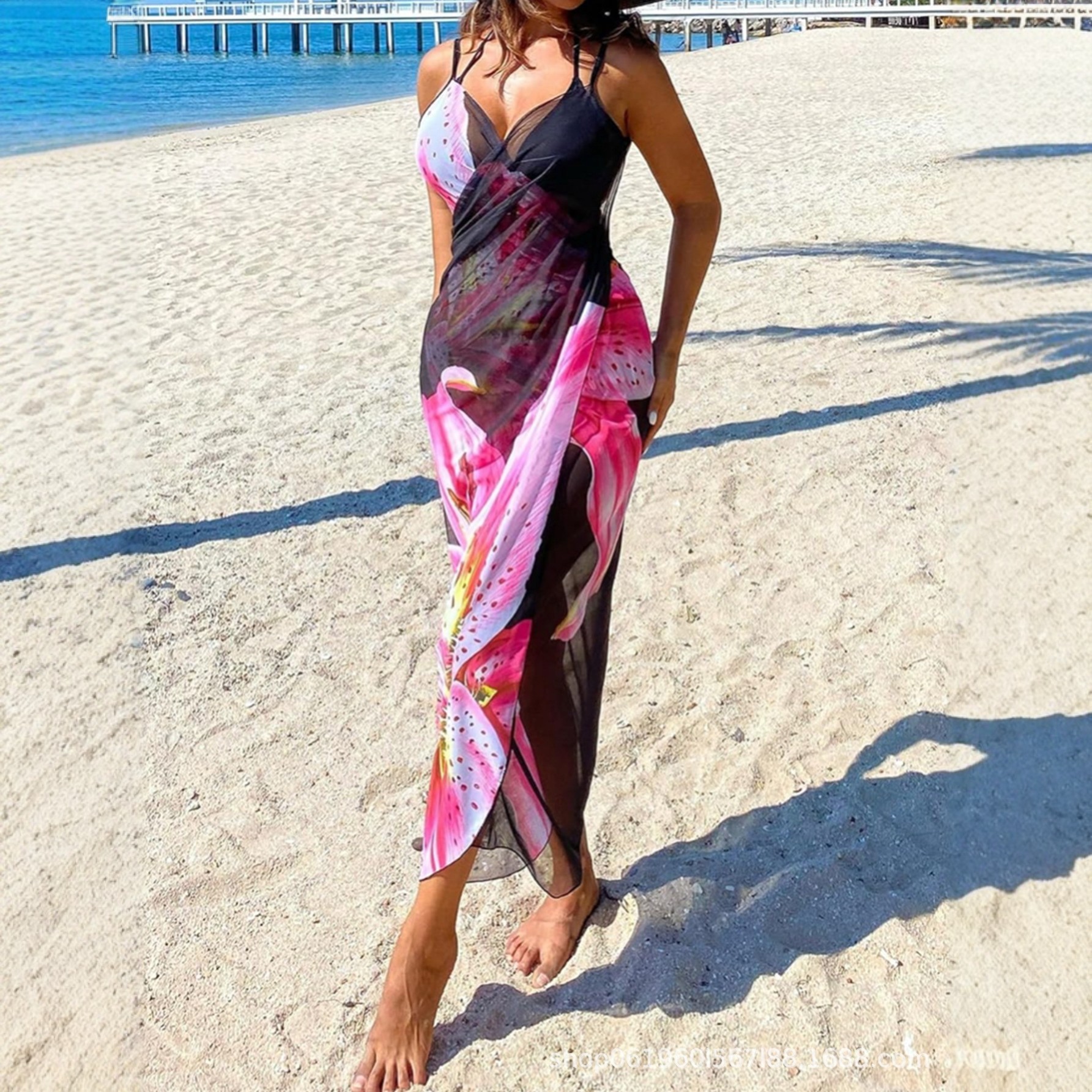 2026新款欧美风印花沙滩防晒罩衫吊带长裙度假风性感开叉连衣裙女