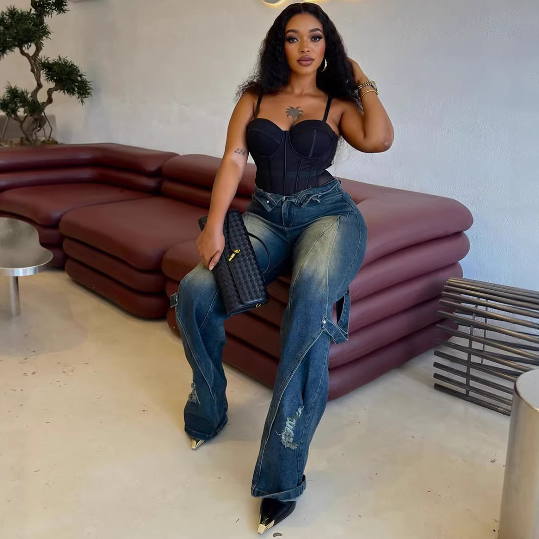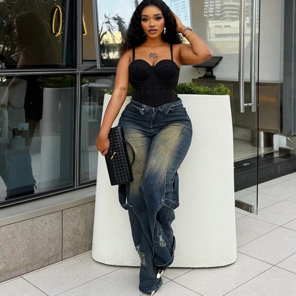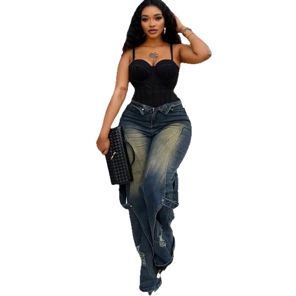 欧美女式阔腿牛仔裤 亚马逊跨境女装时尚水洗扎染磨破直筒工装裤