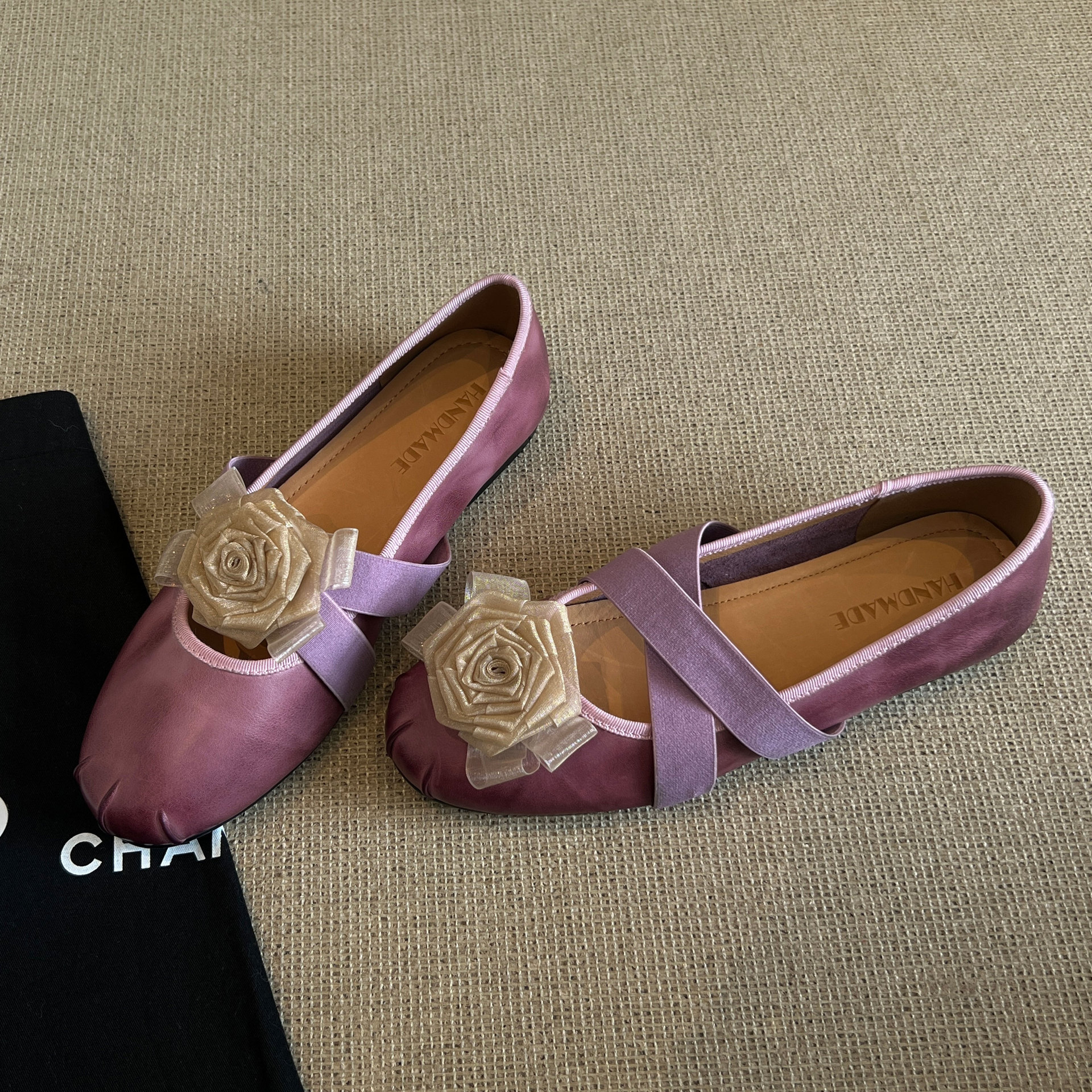 羊皮~内增高4cm复古山茶花玛丽珍鞋女交叉带浅口百搭真皮芭蕾单鞋