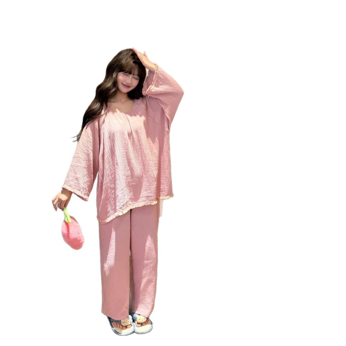 新春季纯棉睡衣女 春夏季长袖长裤套装纯色休闲宽松松弛感家居服