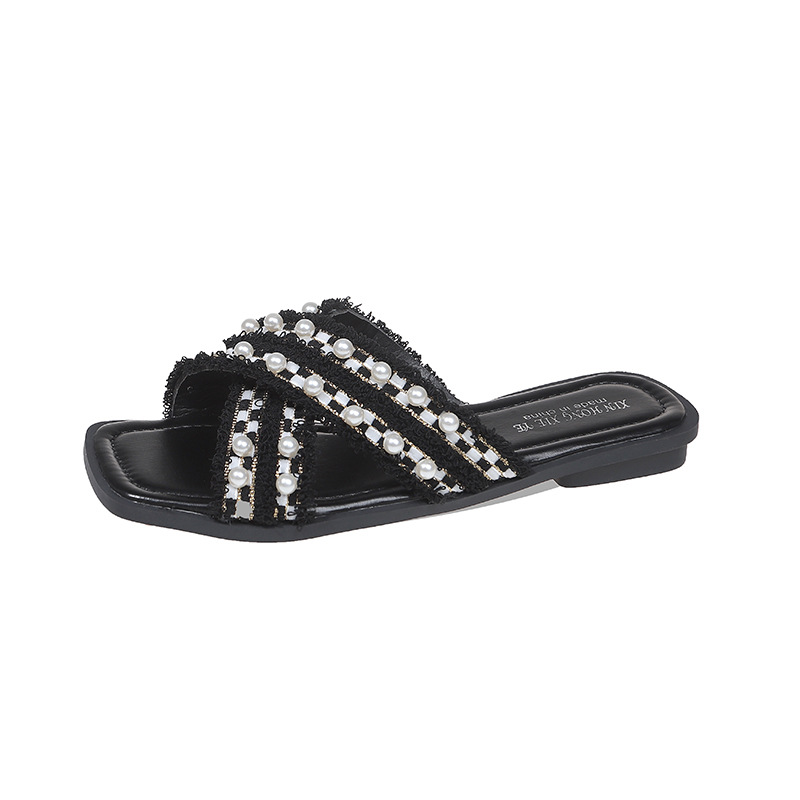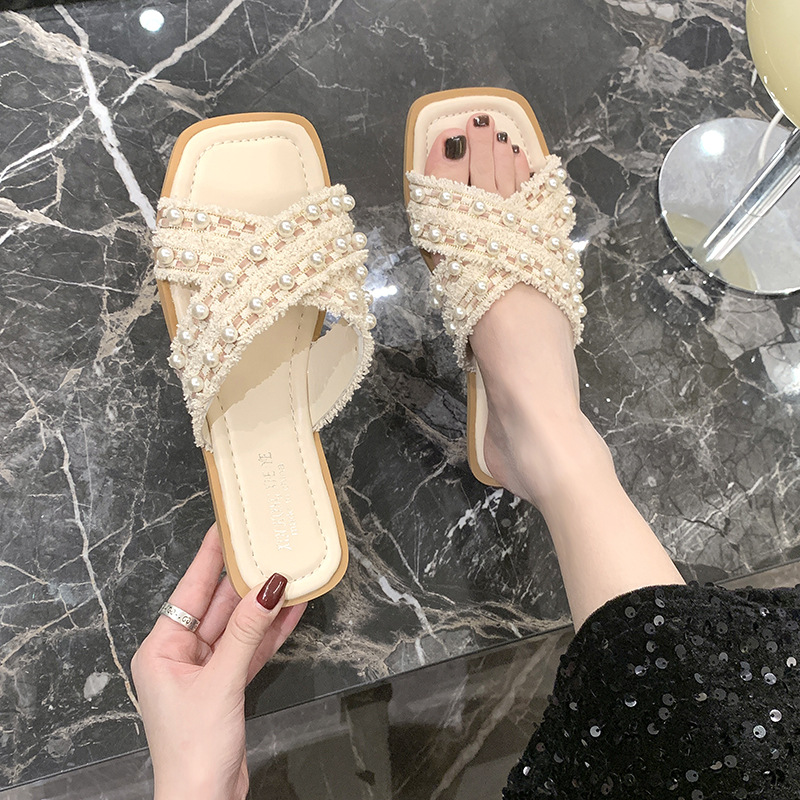 小香风珍珠拖鞋女外穿2026夏新款平底时尚绝美海边沙滩凉拖一字拖