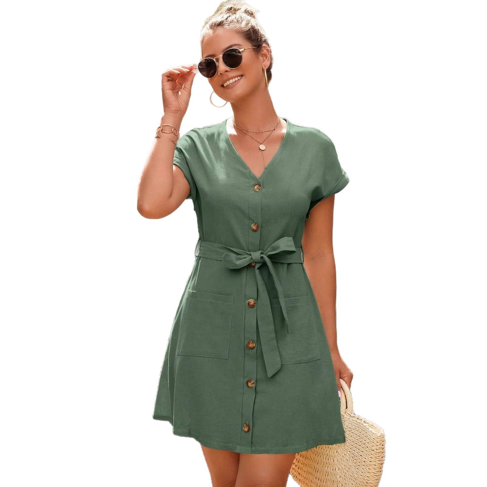 跨境欧美女装夏季新款休闲V领系带口袋气质连衣裙女亚马逊1740