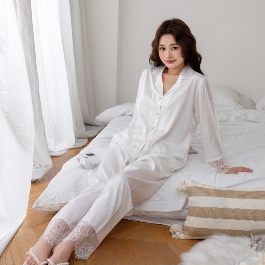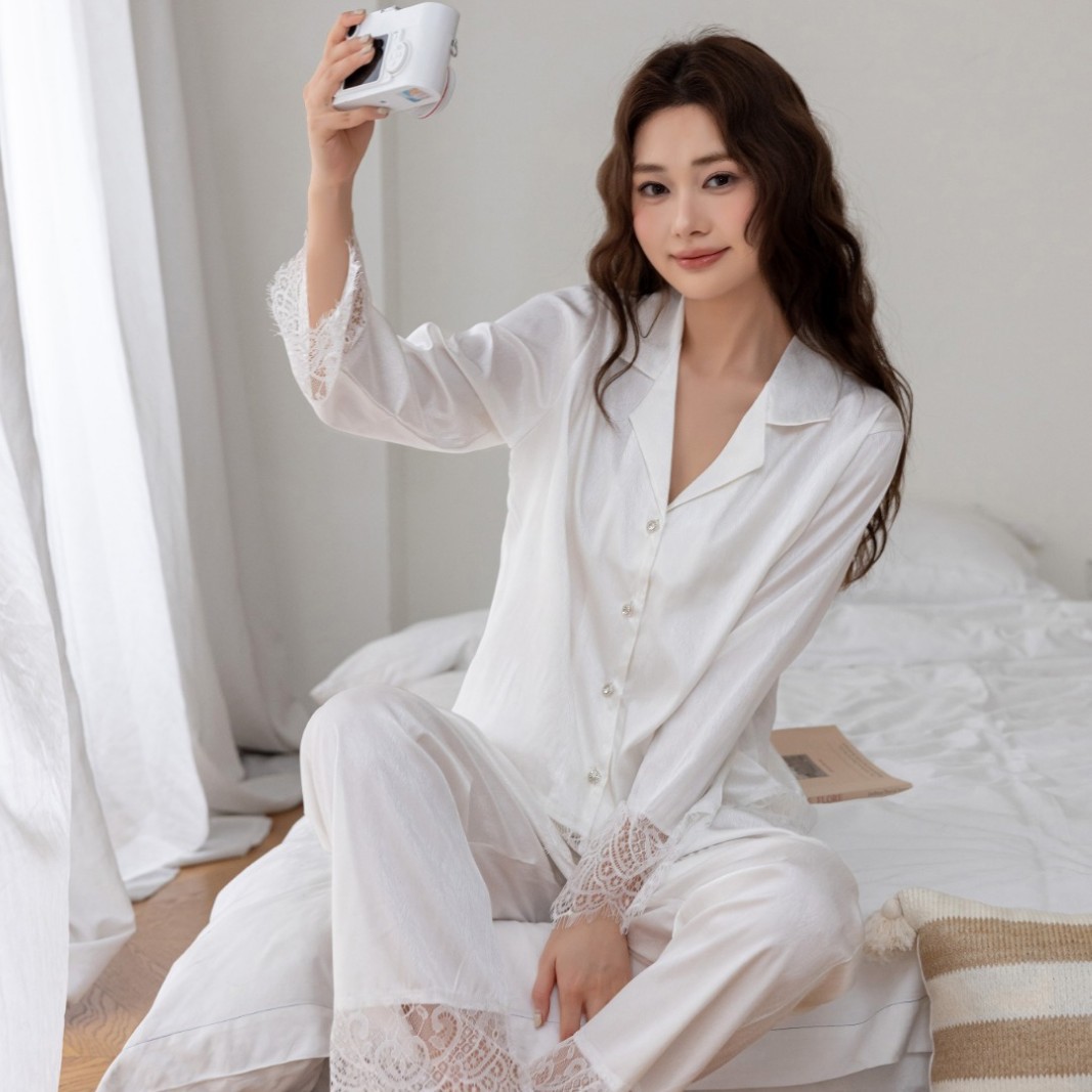 源头厂家2026年春季新款轻奢简约纯色蕾丝花边睡衣女冰丝家居服