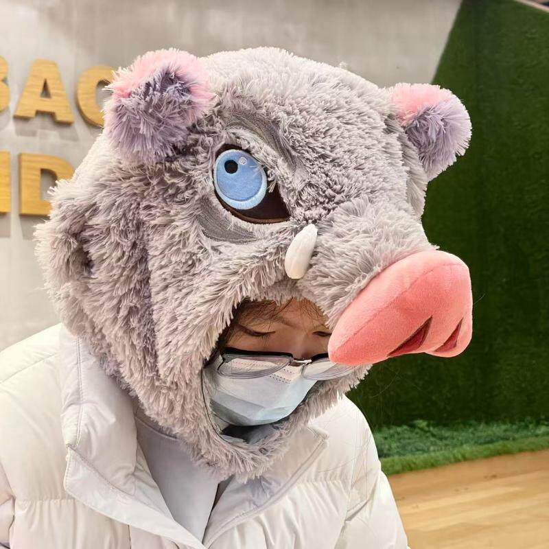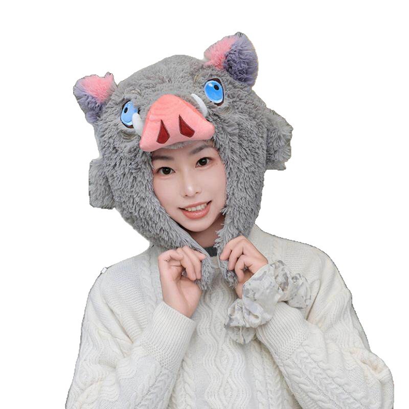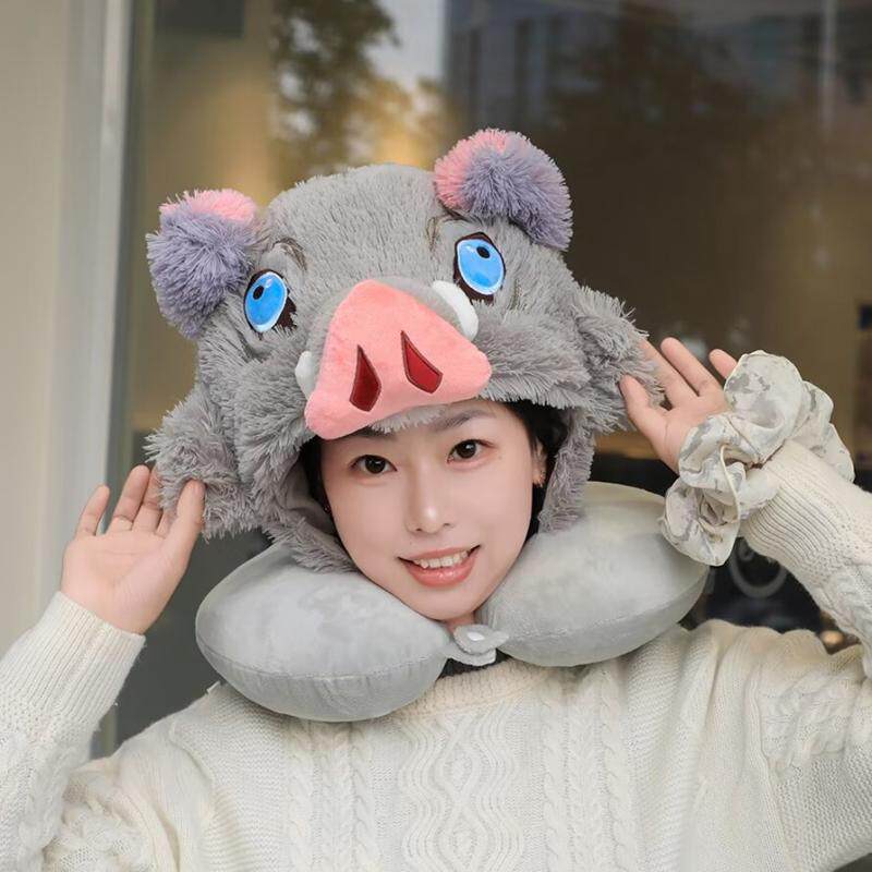 动漫鬼灭之刃周边嘴平伊之助猪猪连帽U型枕野猪头套毛绒帽子 现货