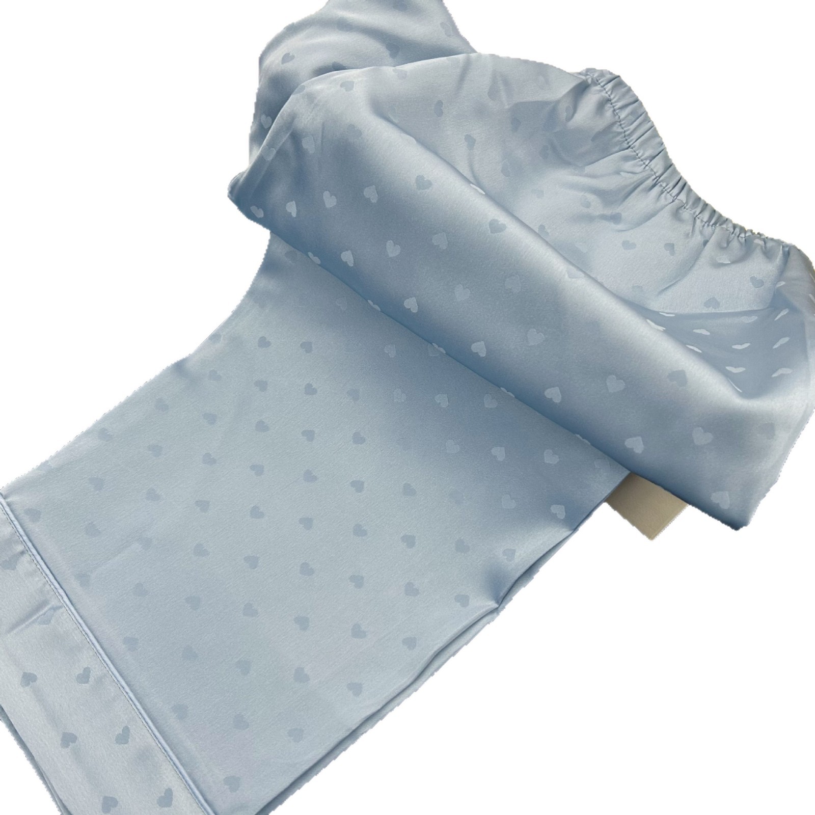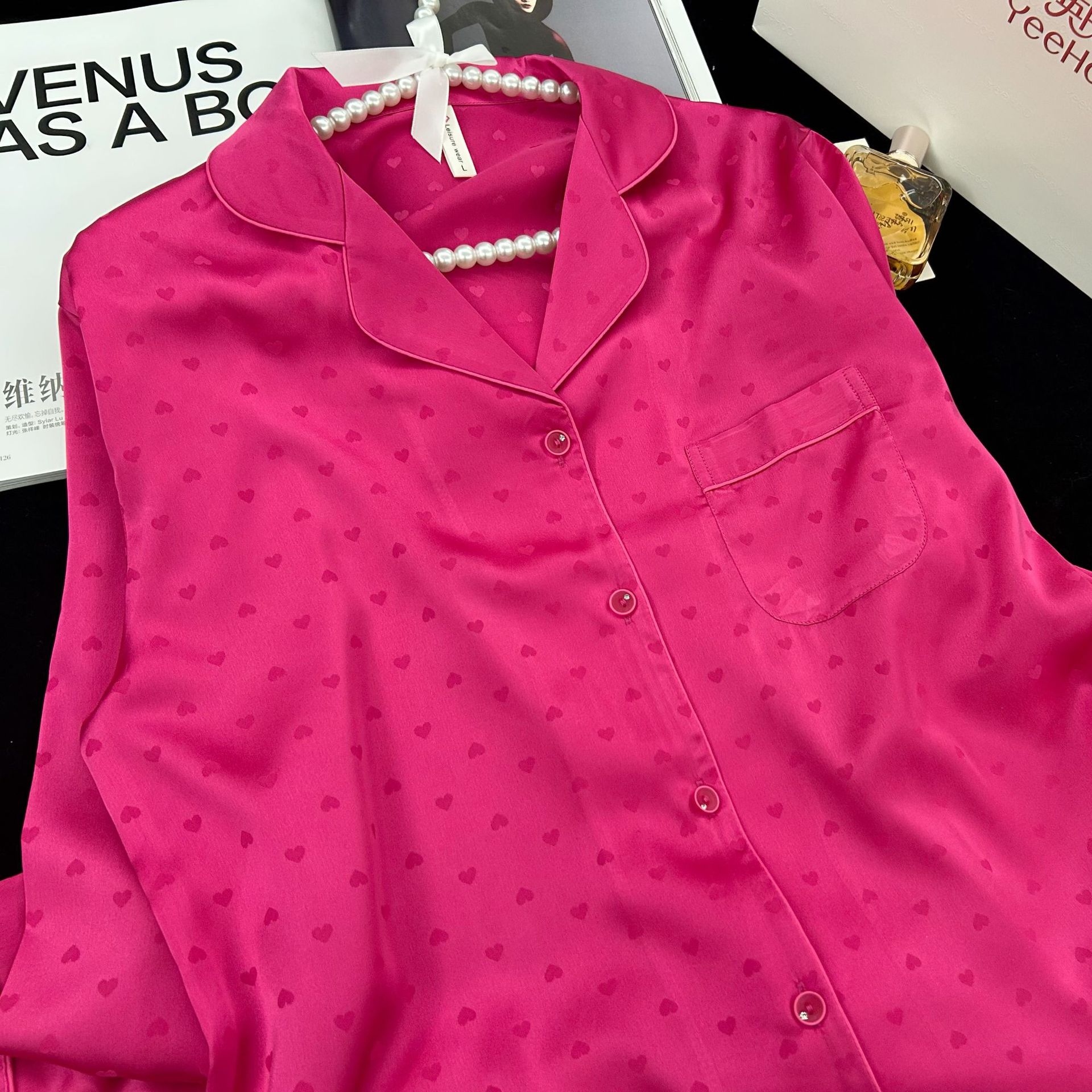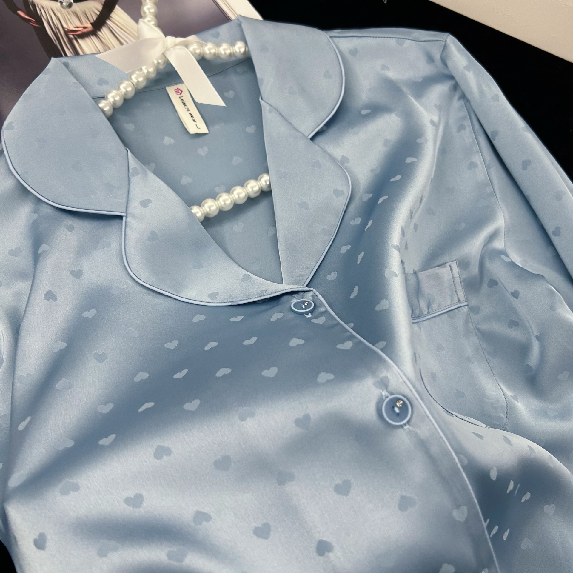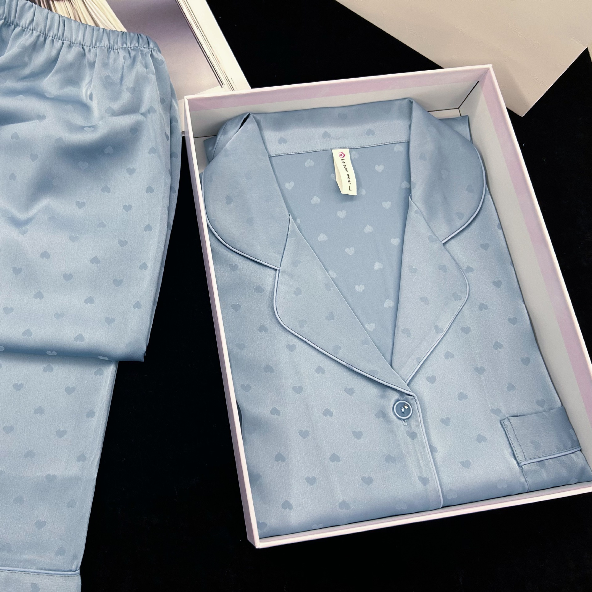 跨境冰丝睡衣女简约爱心提花长袖长裤套装家居服外贸批发