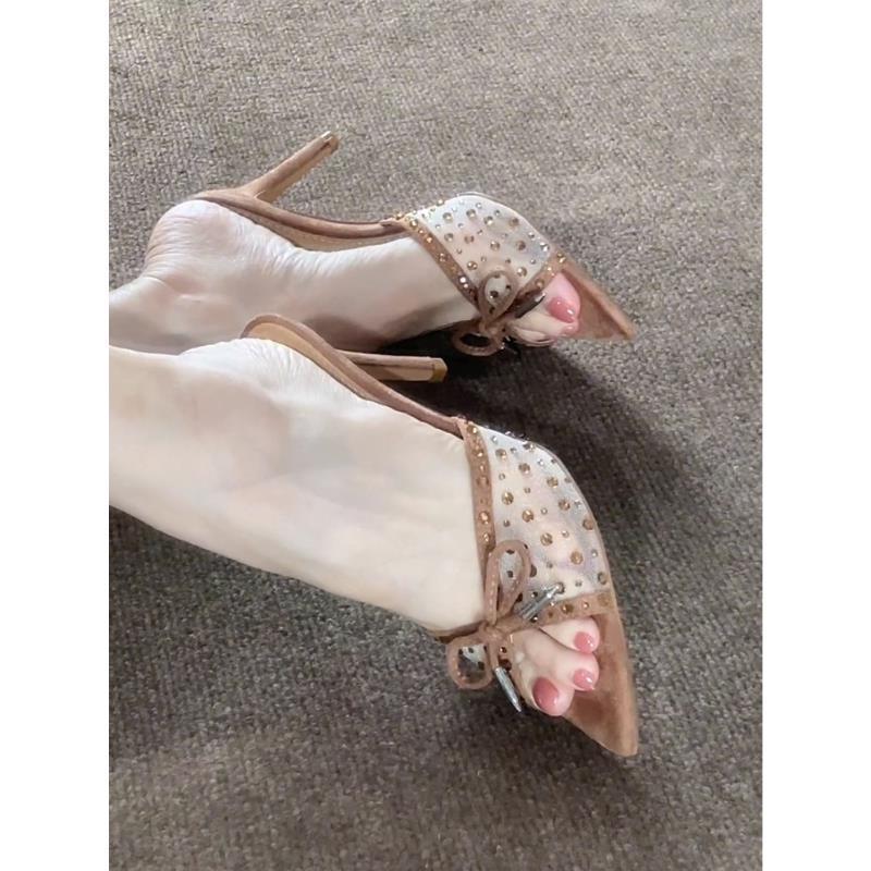 初遇季尖头网纱蝴蝶结高跟拖鞋女夏季外穿水钻细跟高跟鞋棕色黑色