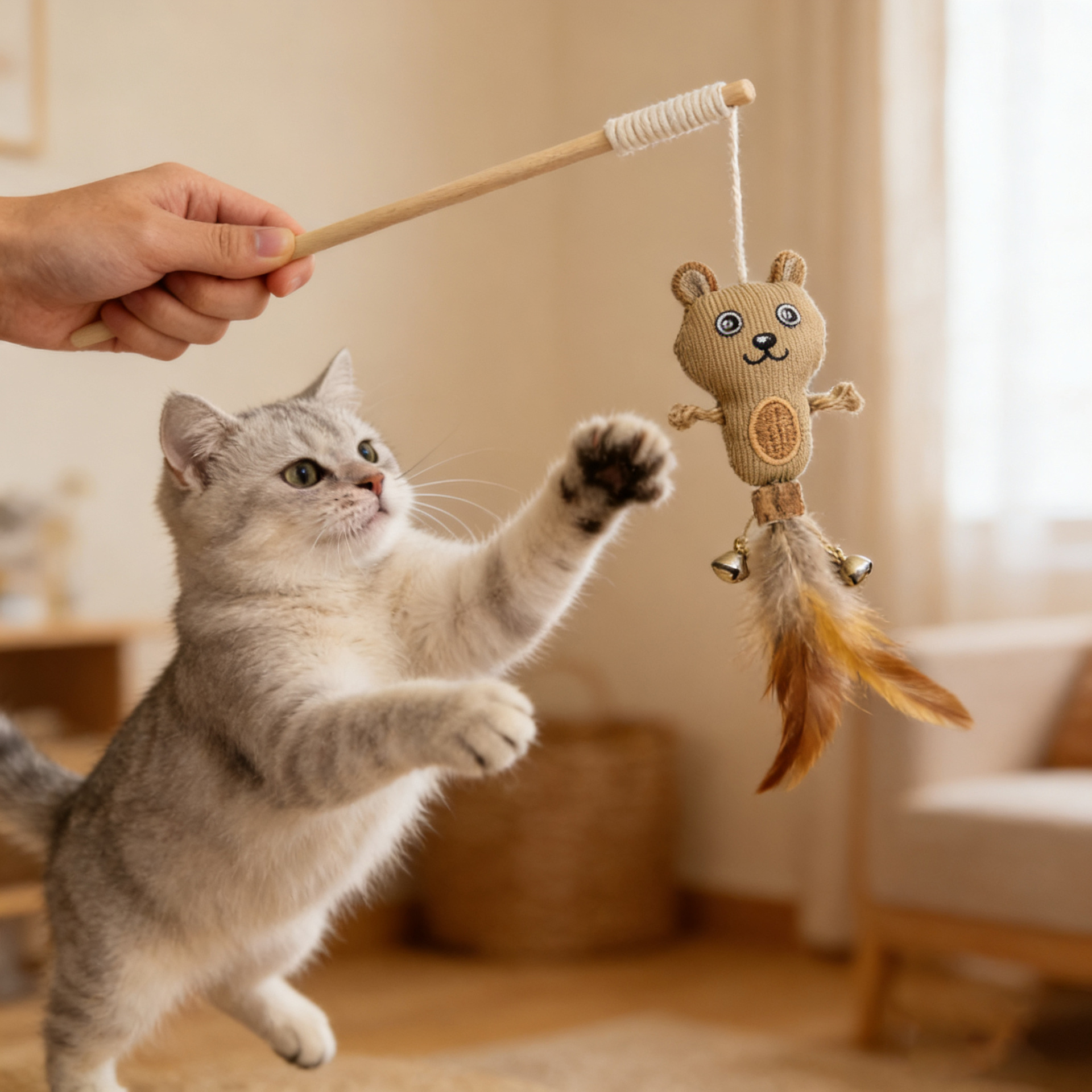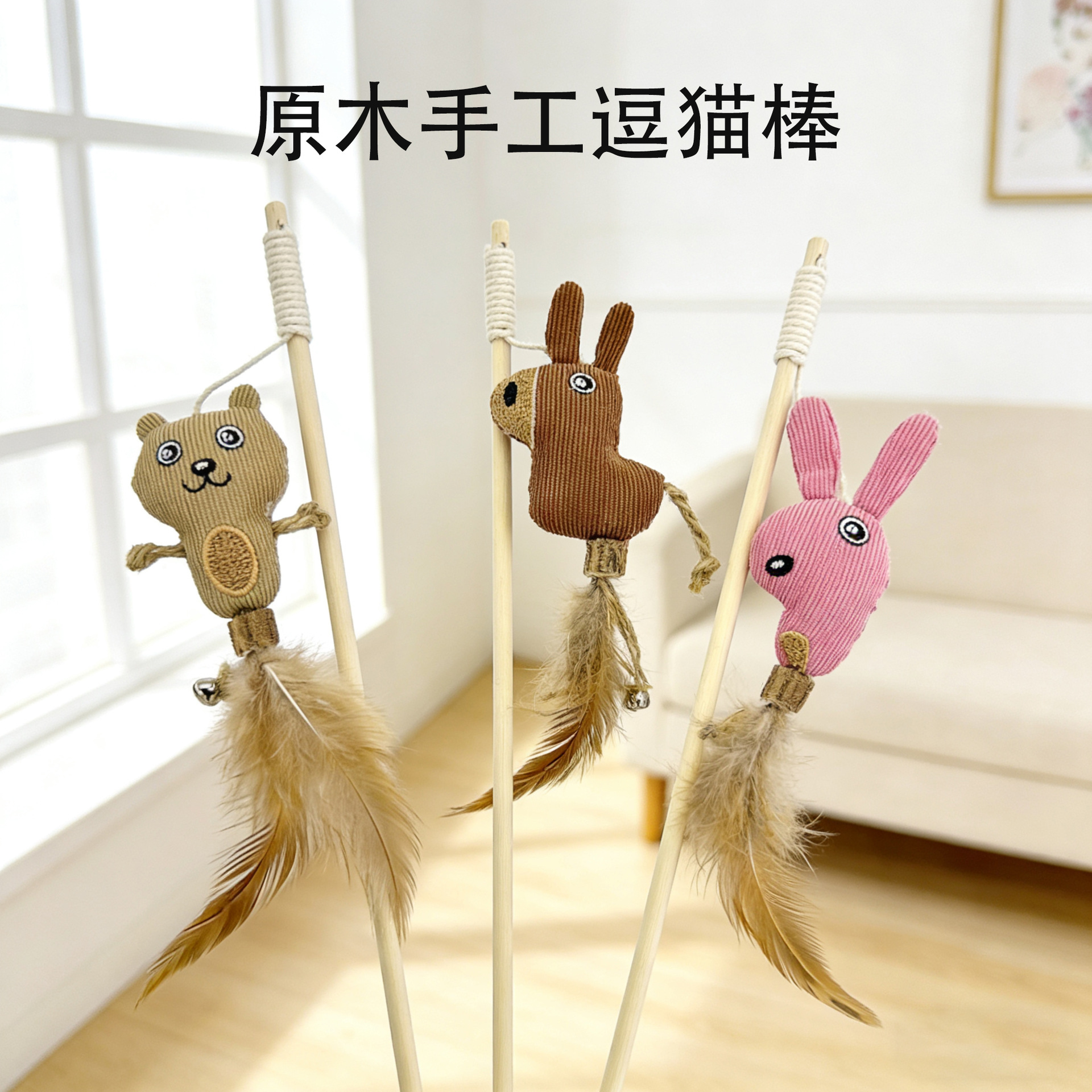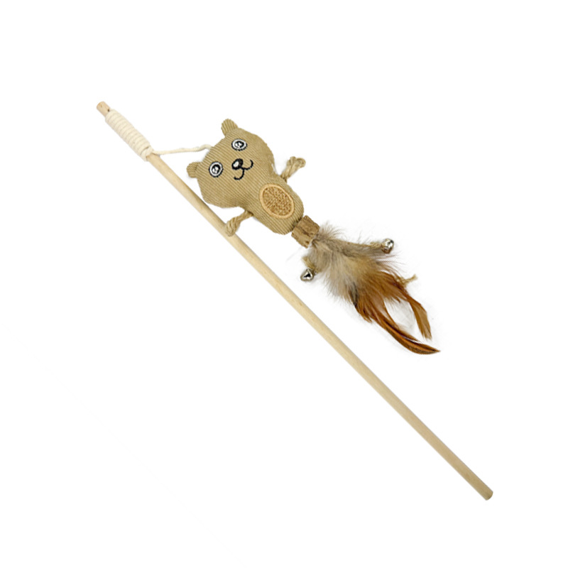 木质麻布木杆逗猫棒玩具手工羽毛铃铛新宠物猫咪用品剑麻跨境爆款