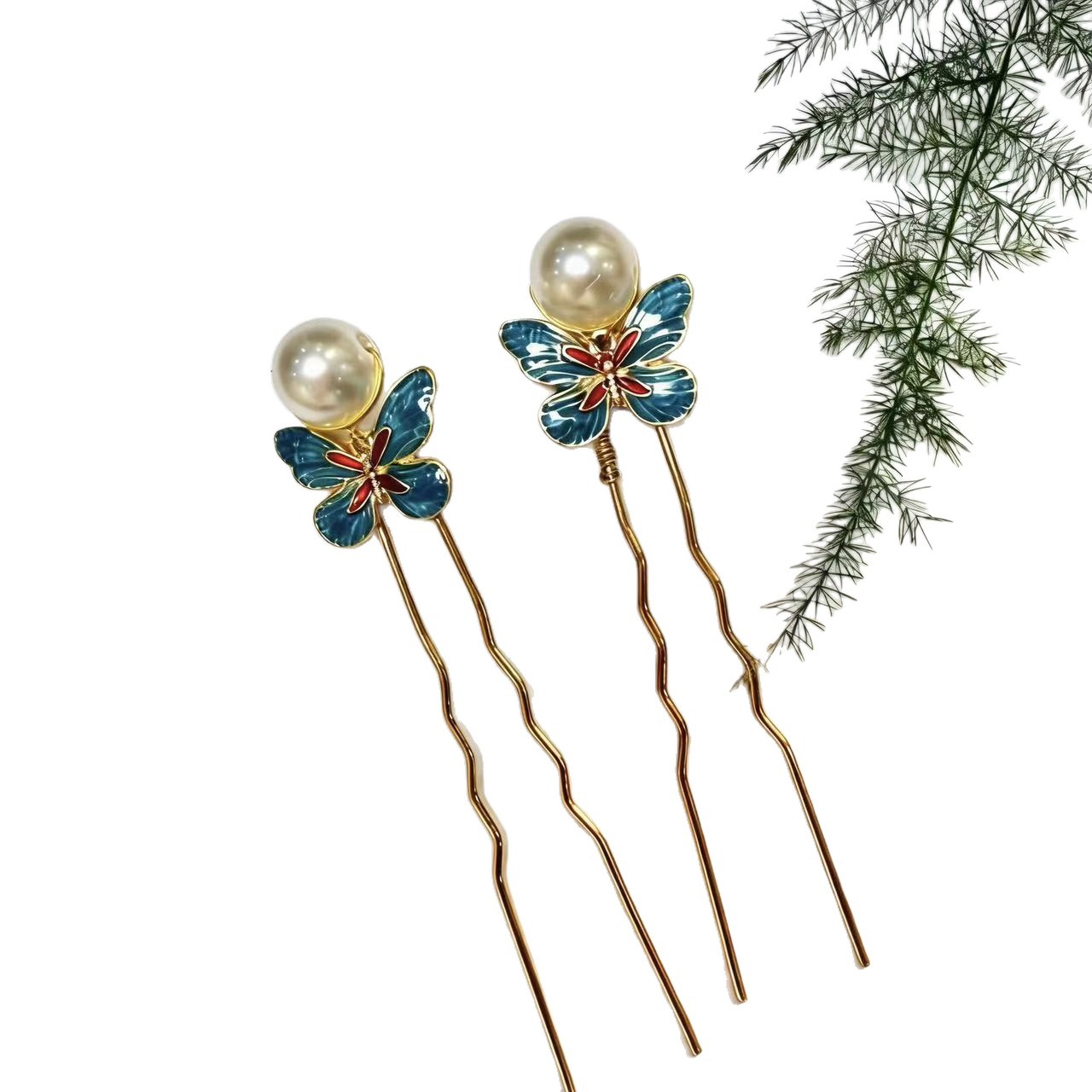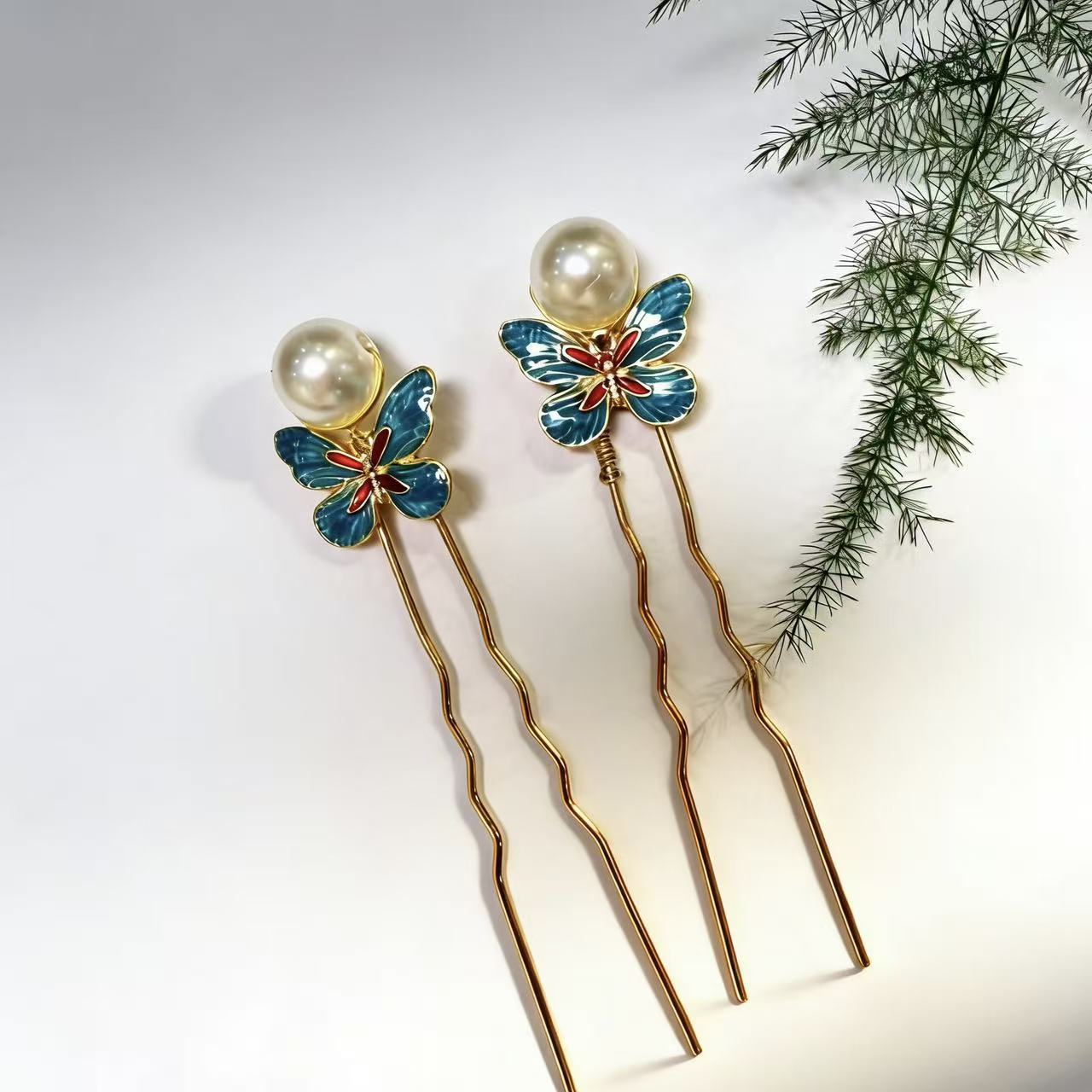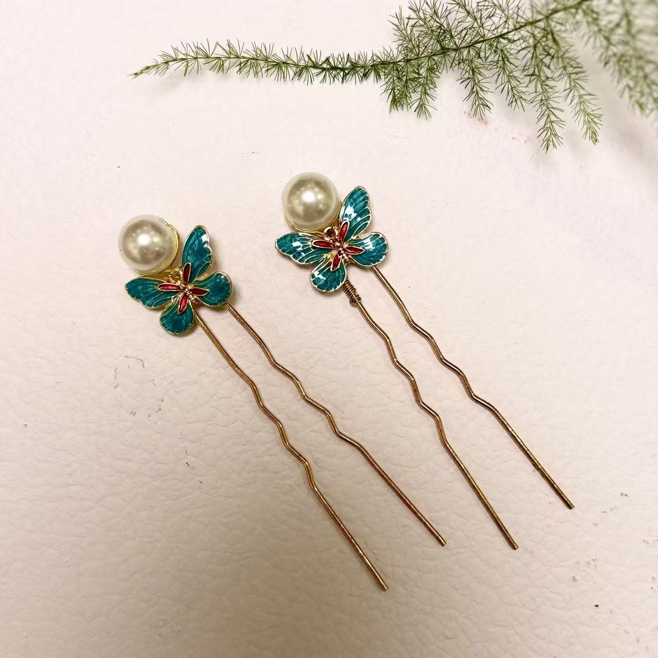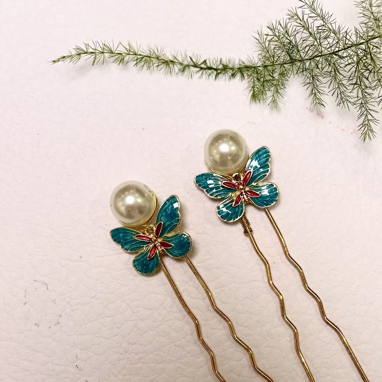 原创新款珍珠珐琅古风造型蝴蝶发钗发簪子汉服可爱头饰