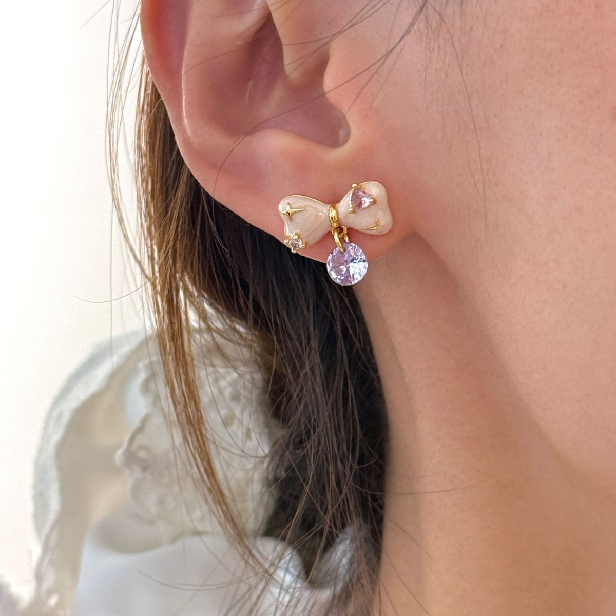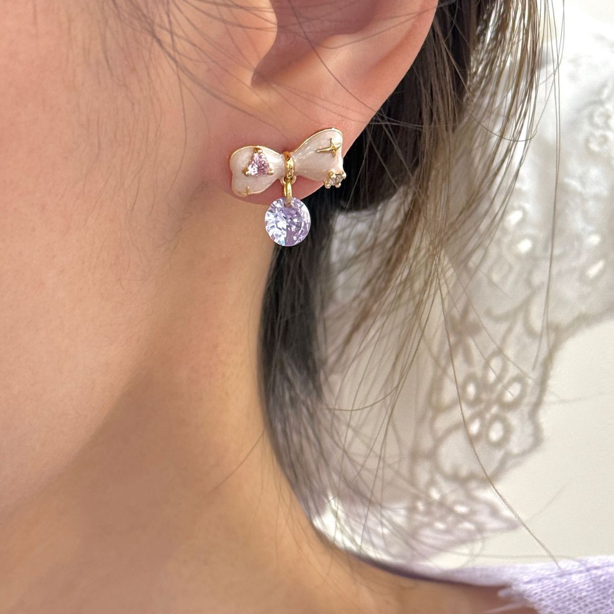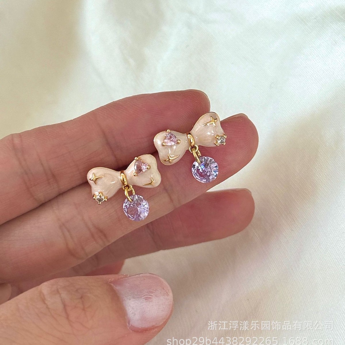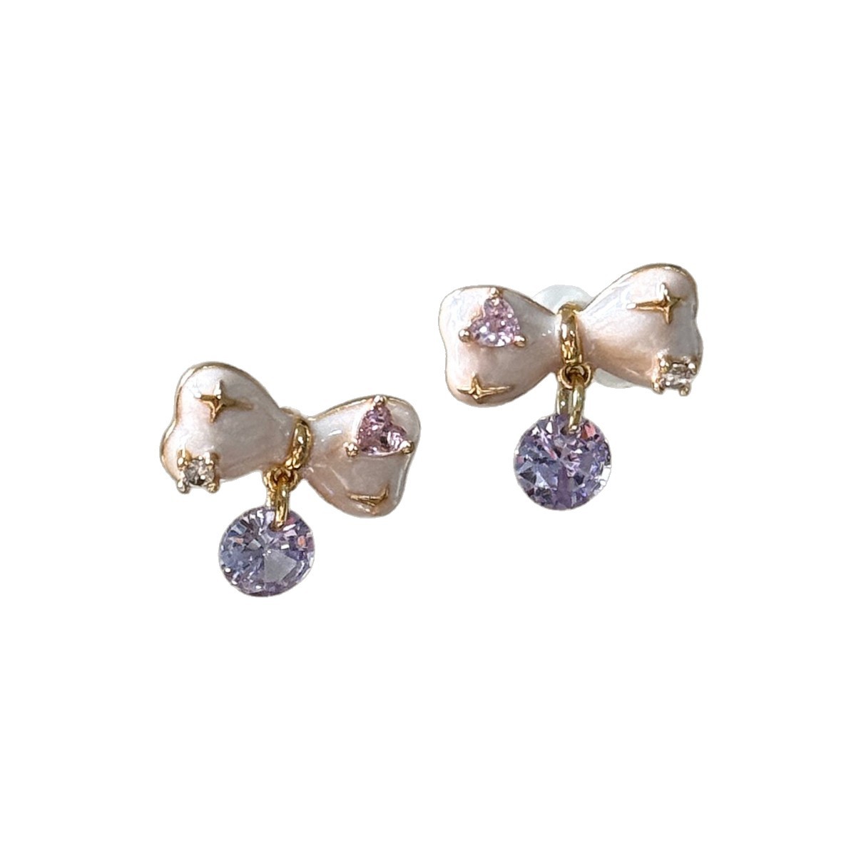 甜美珐琅滴釉淡粉色蝴蝶结淡紫色锆石吊坠耳钉法式浪漫风优雅耳饰