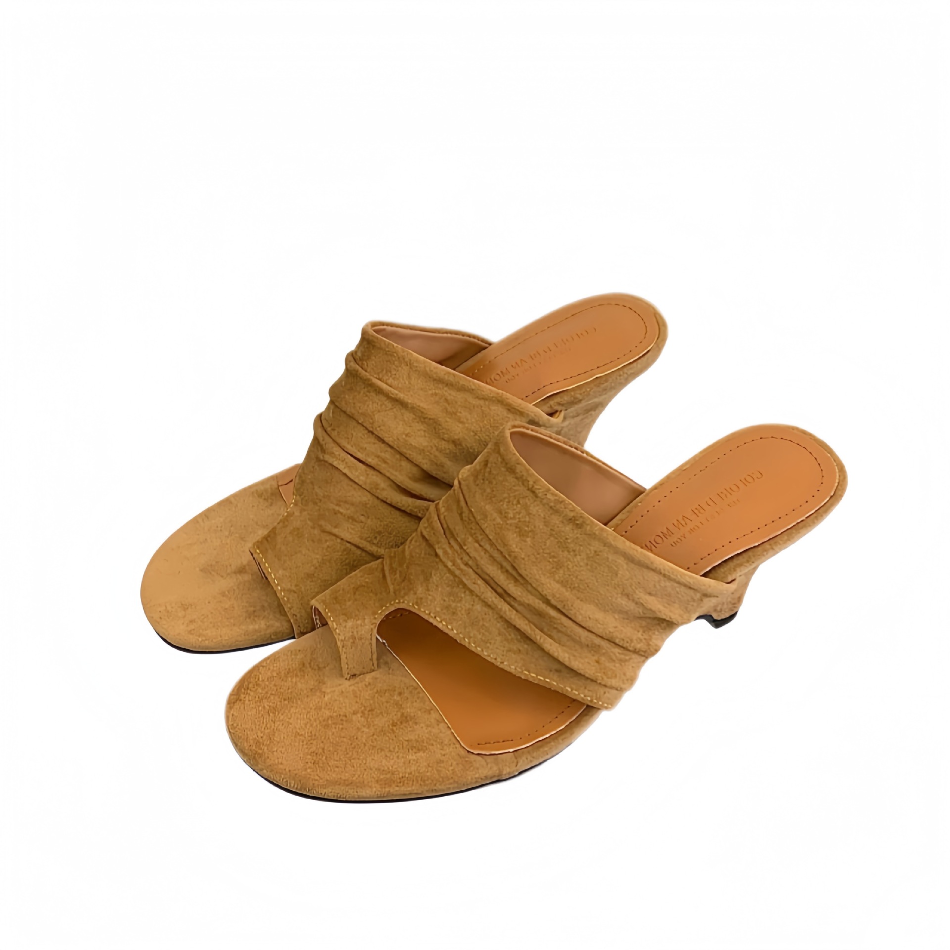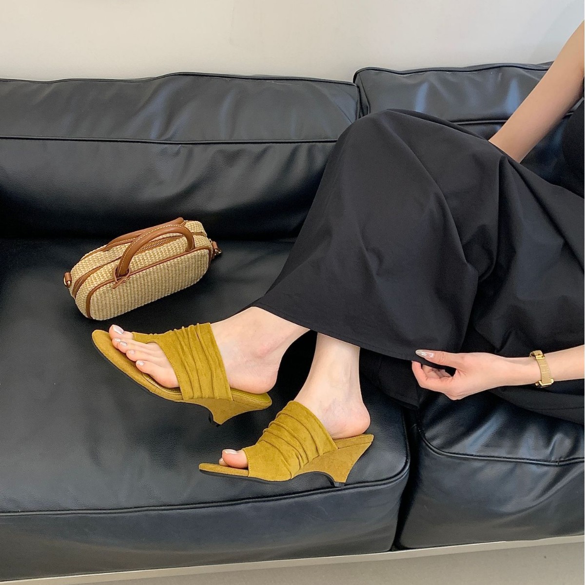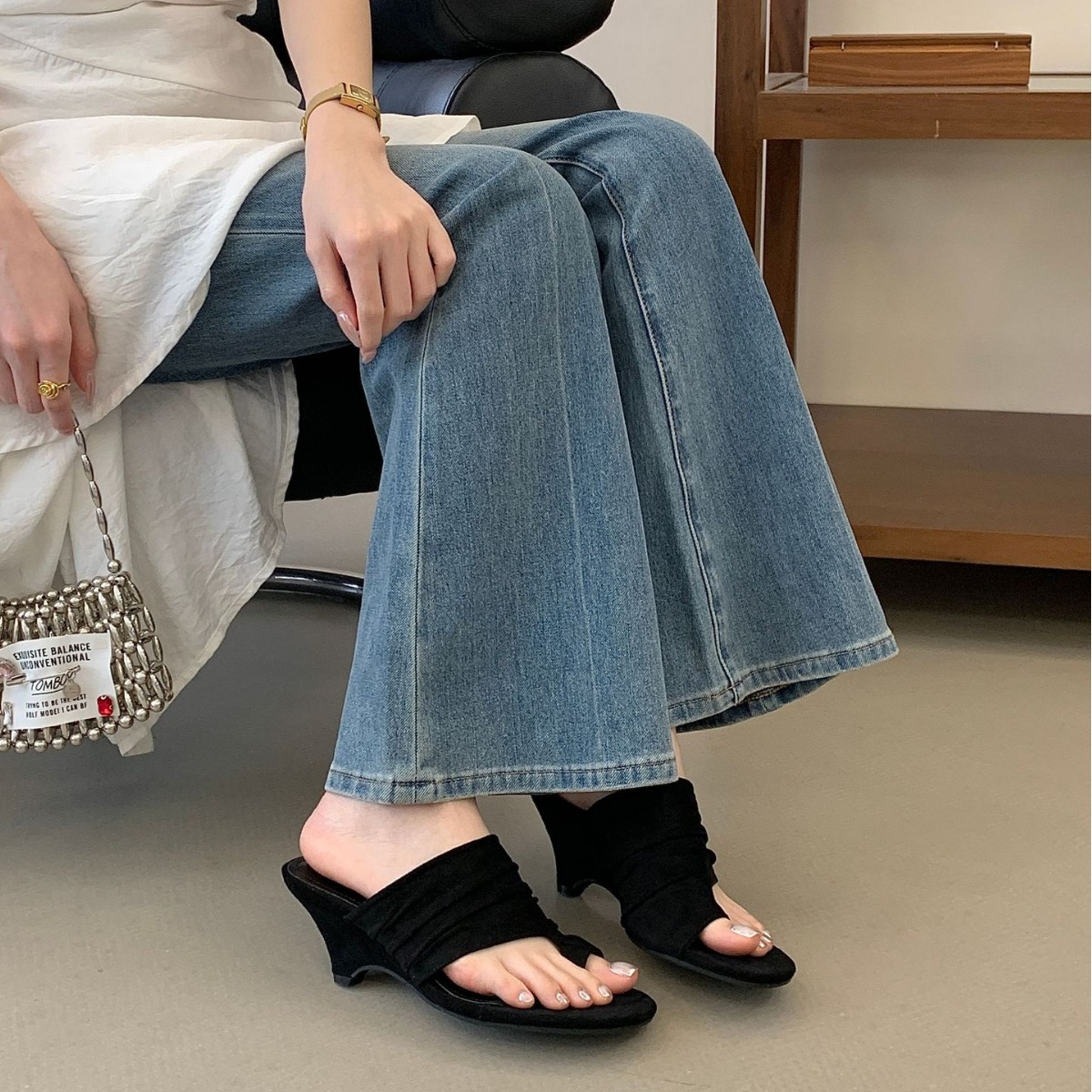 新款韩版夹趾细跟高跟外穿拖鞋女羊皮通勤方头人字拖简约工作凉鞋