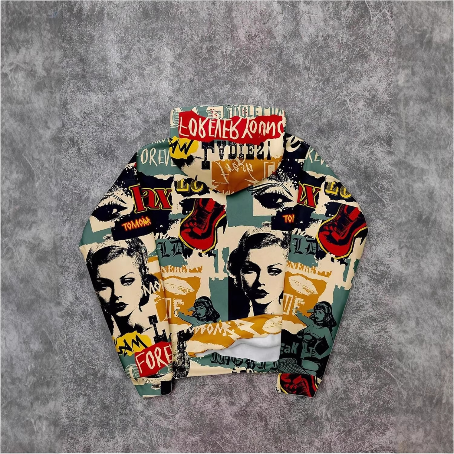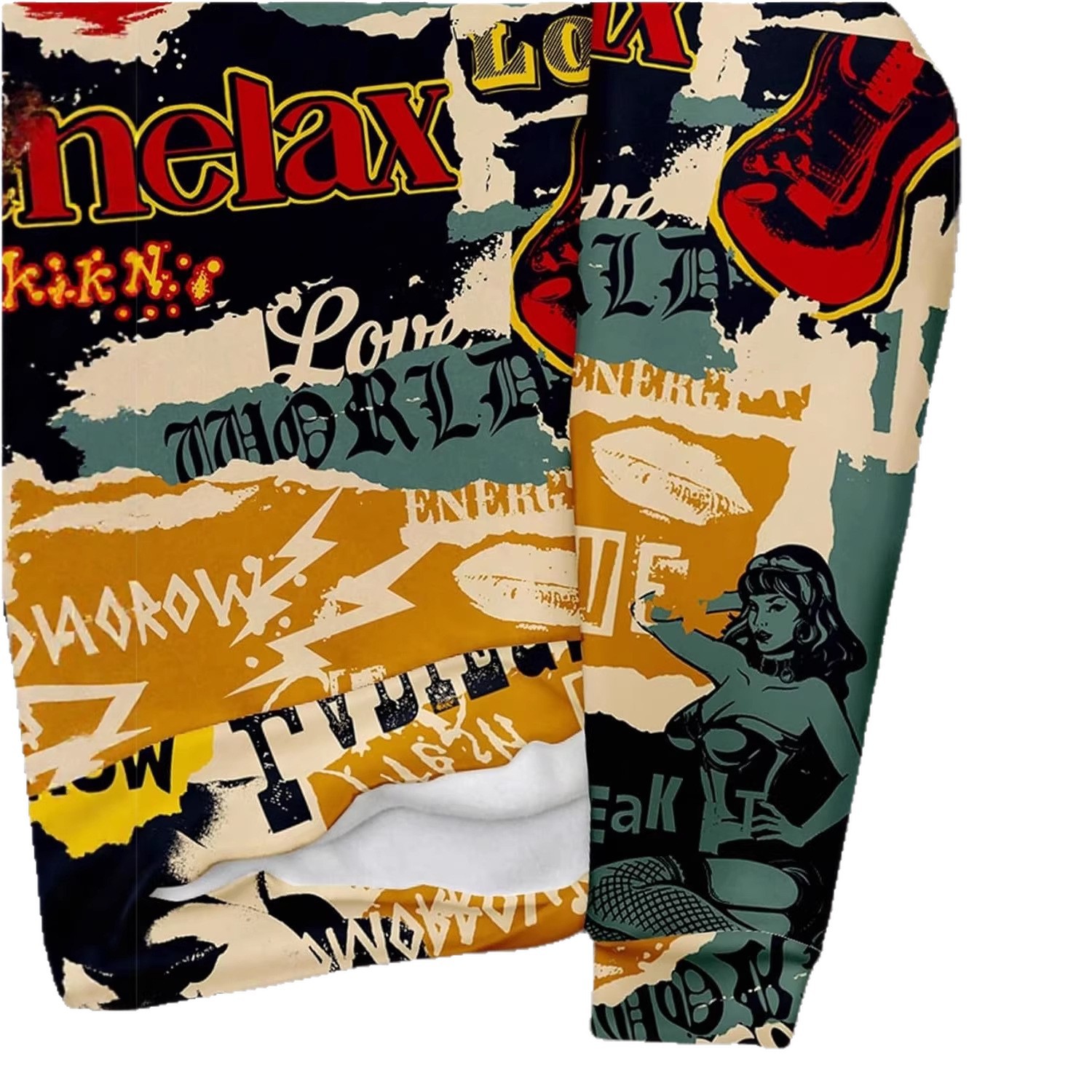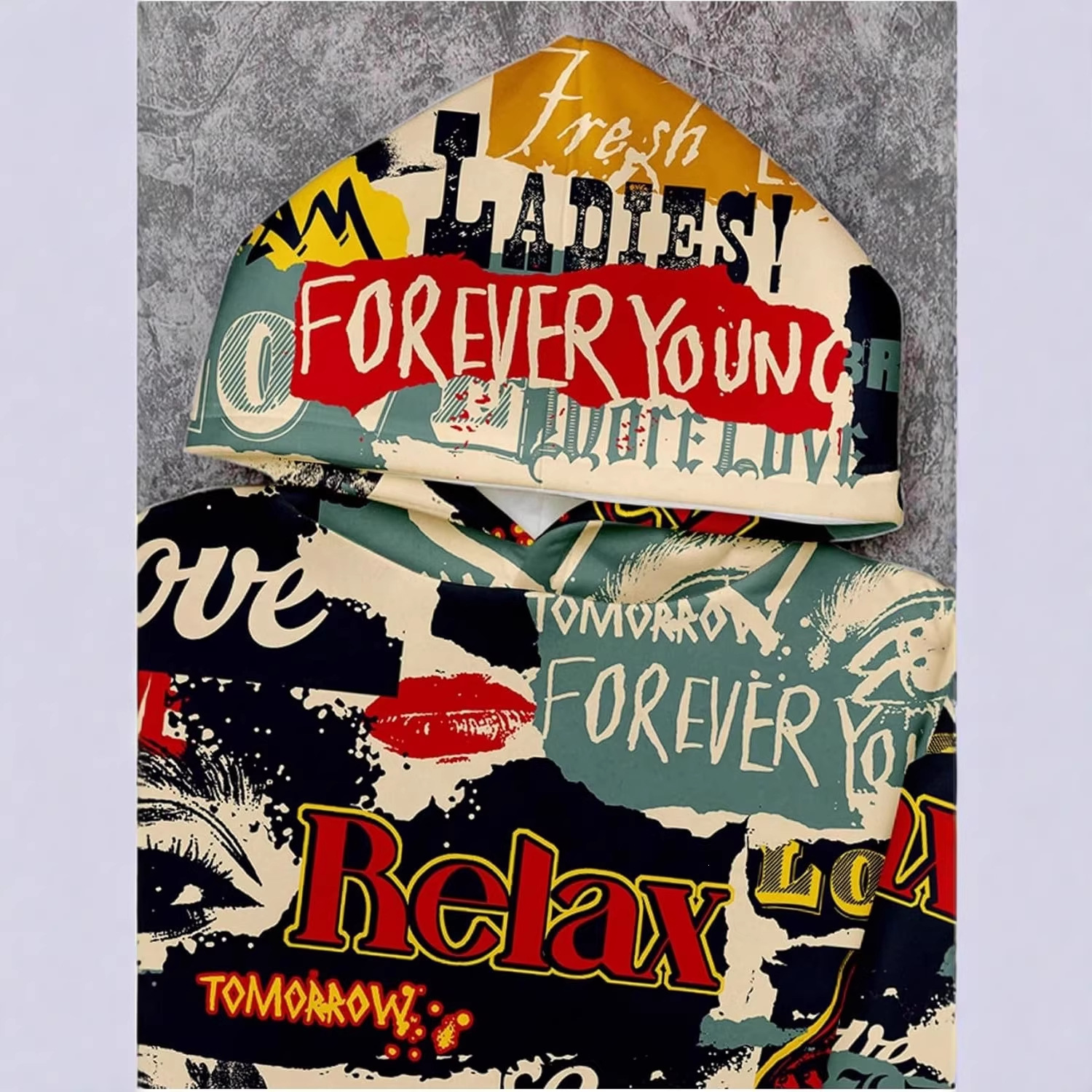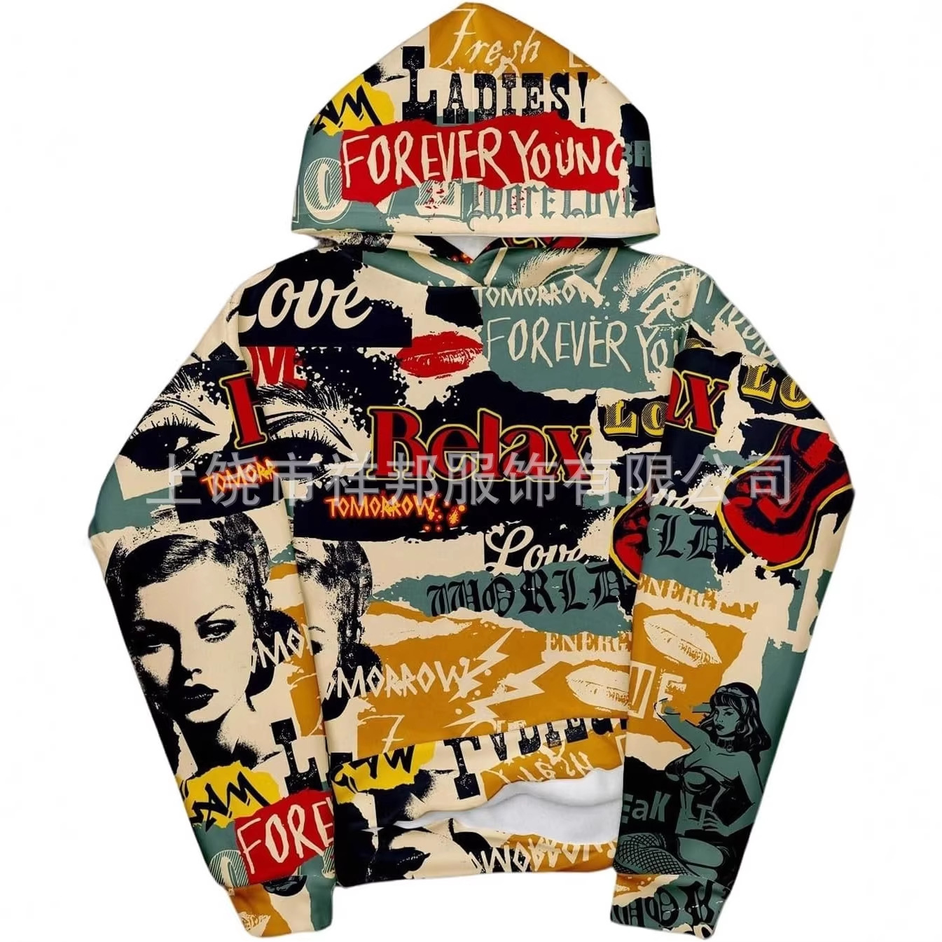 报纸印花连帽卫衣潮牌Relax 满印宽松情侣款套头帽衫拉夫劳伦卫衣