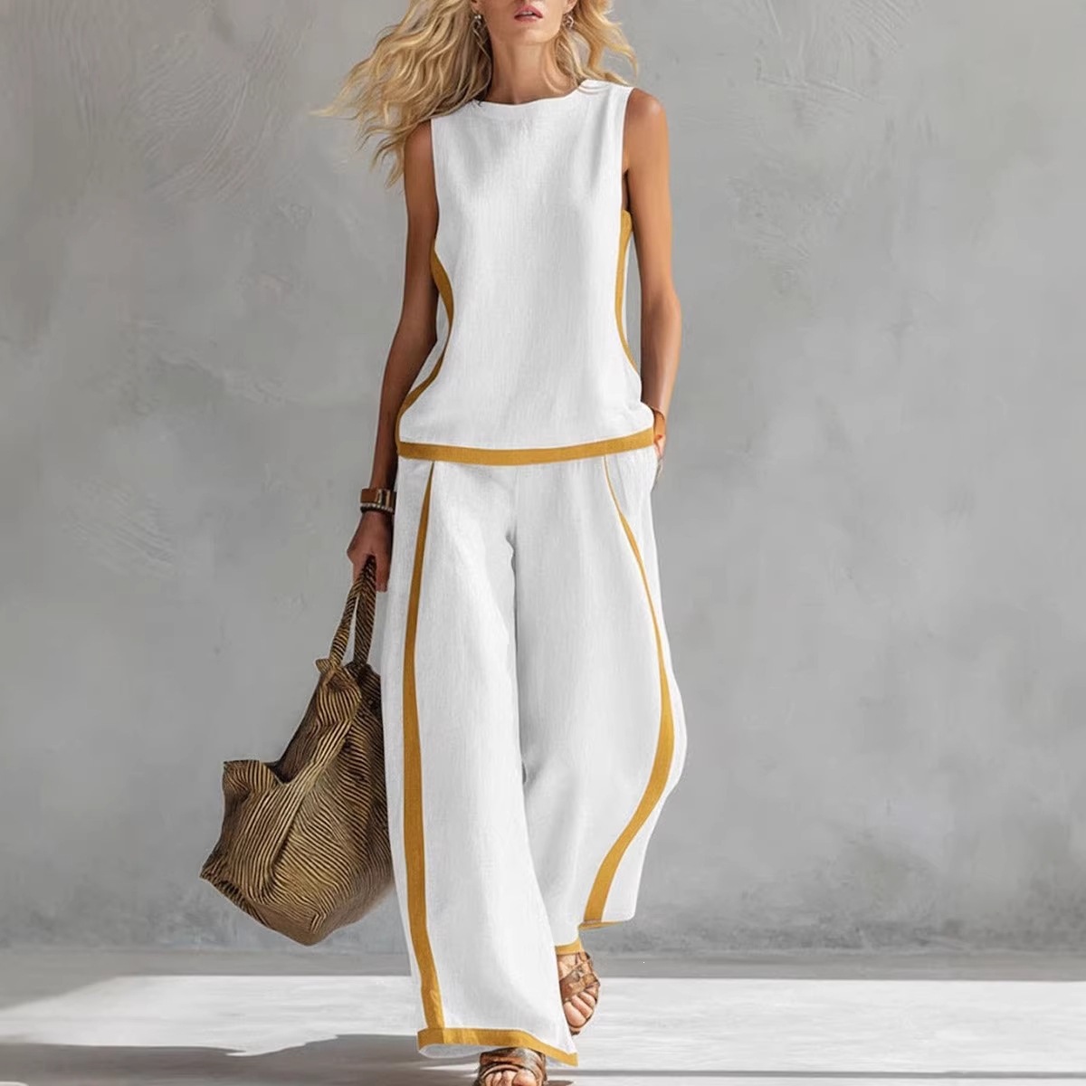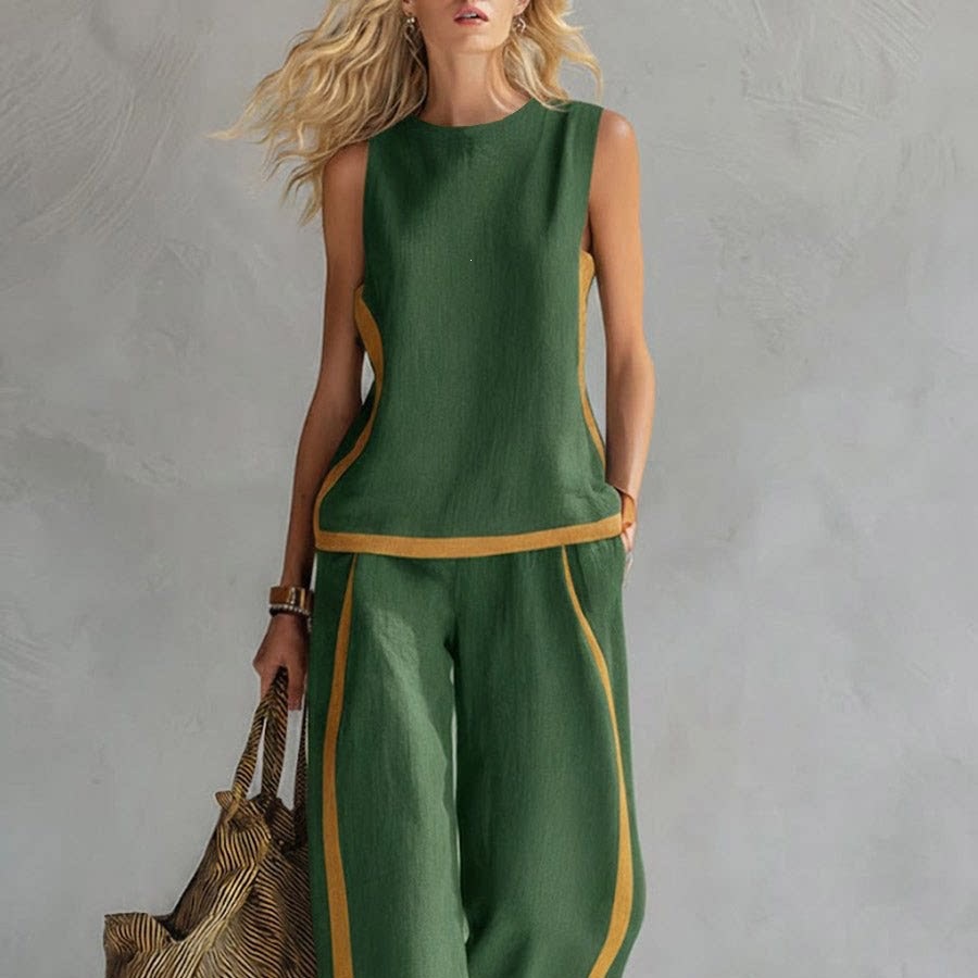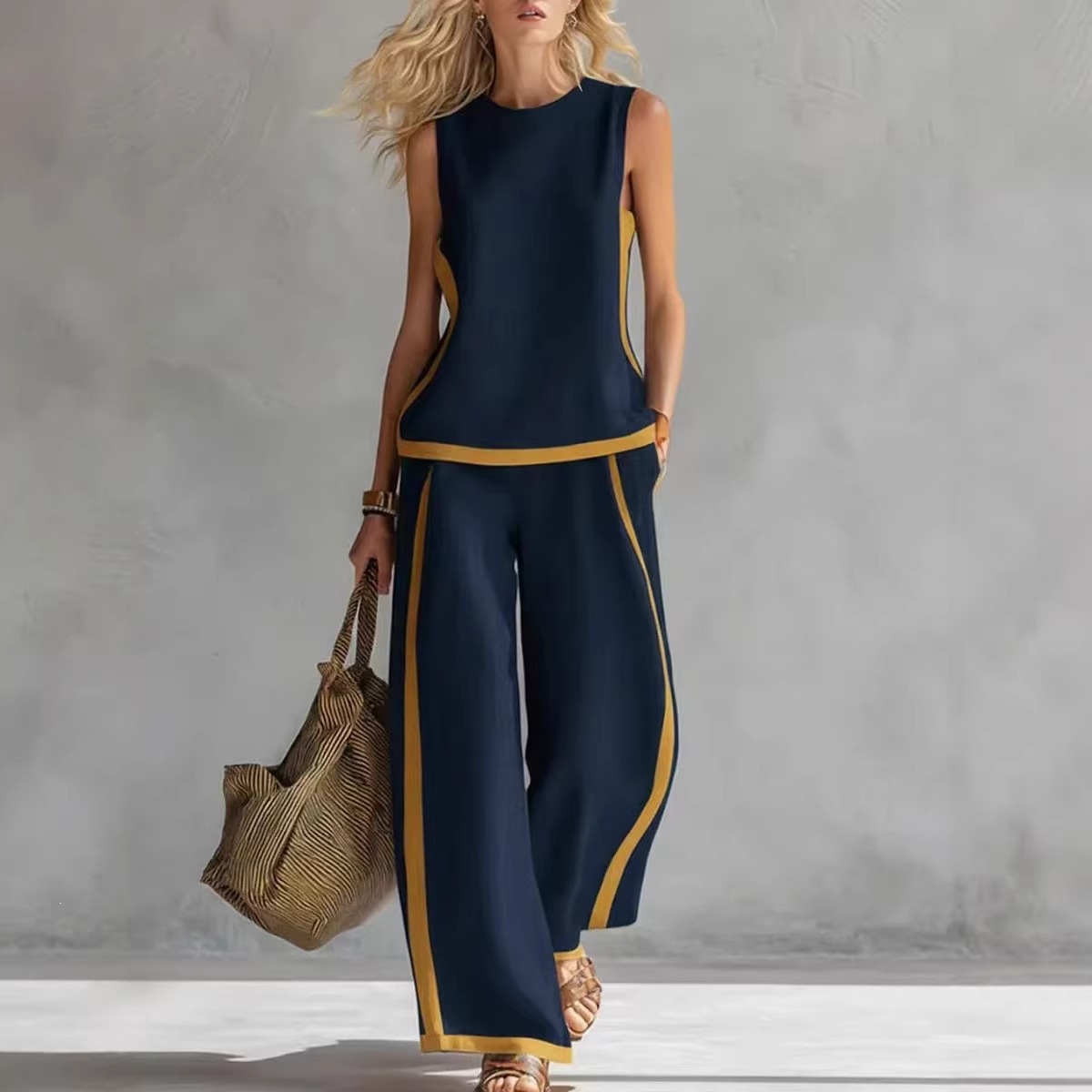 2026新款跨境欧美风无袖撞色阔腿裤套装女印花夏季休闲时尚两件套