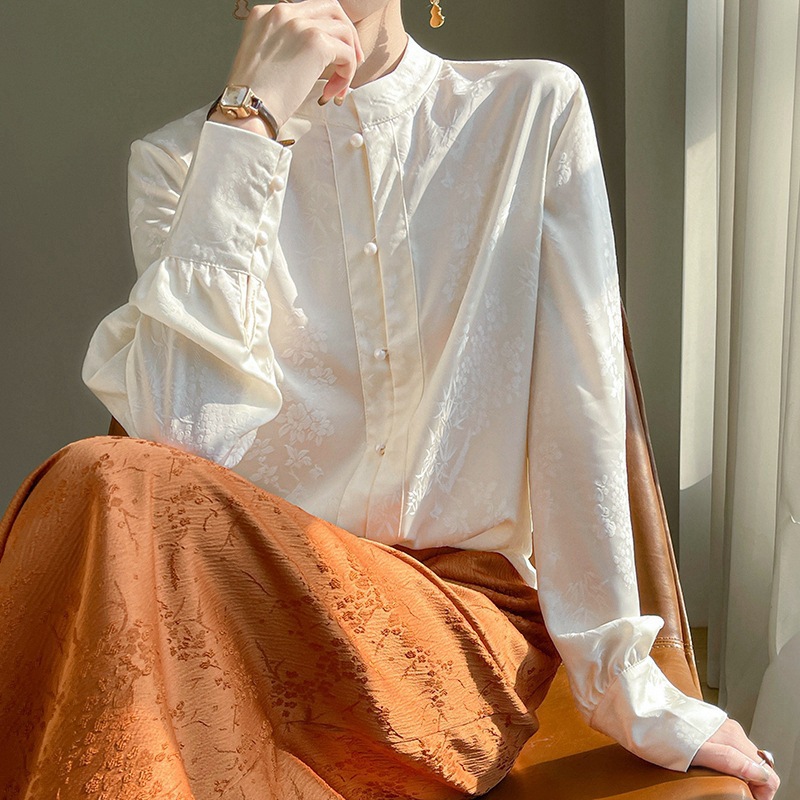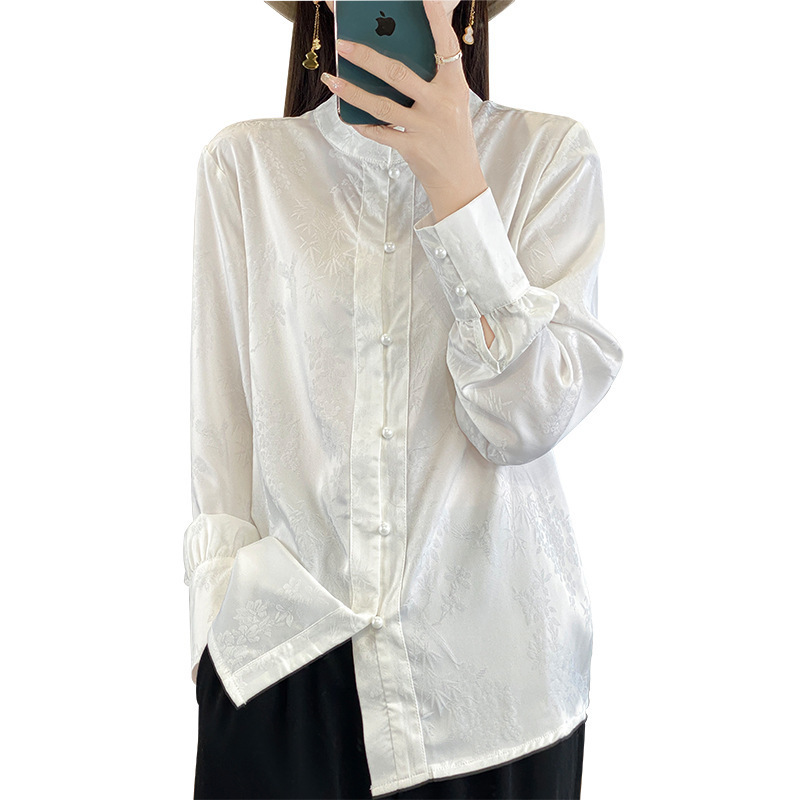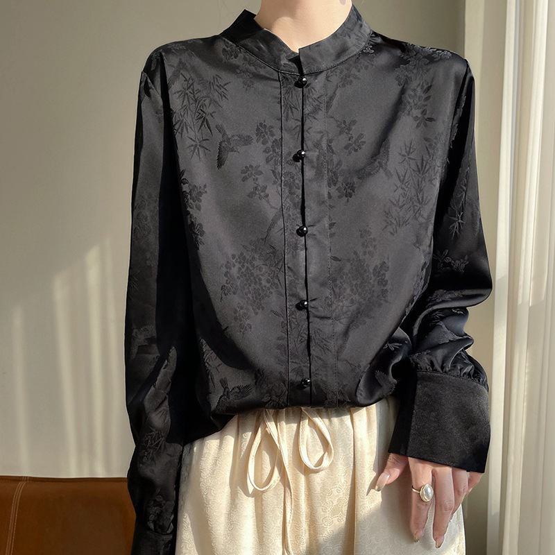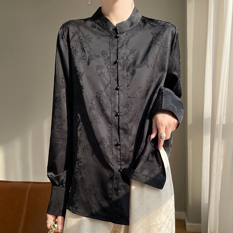 丝绸缎面2026春夏季女装新款缎面新中式立领盘扣长袖衬衫暗花上衣
