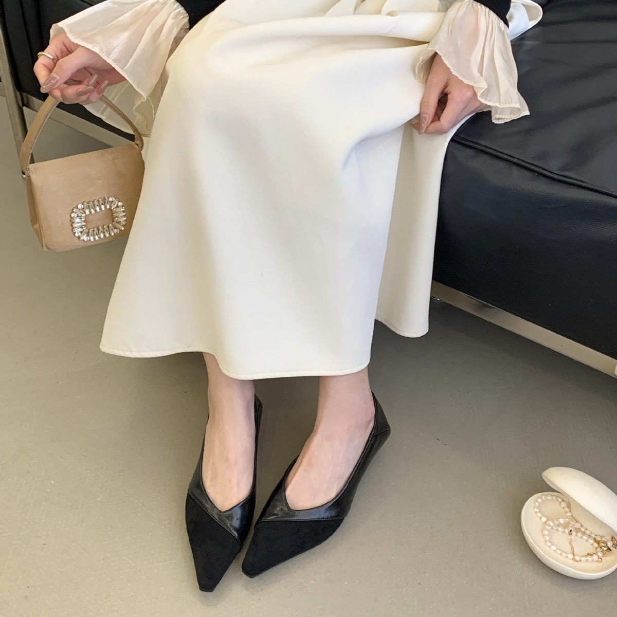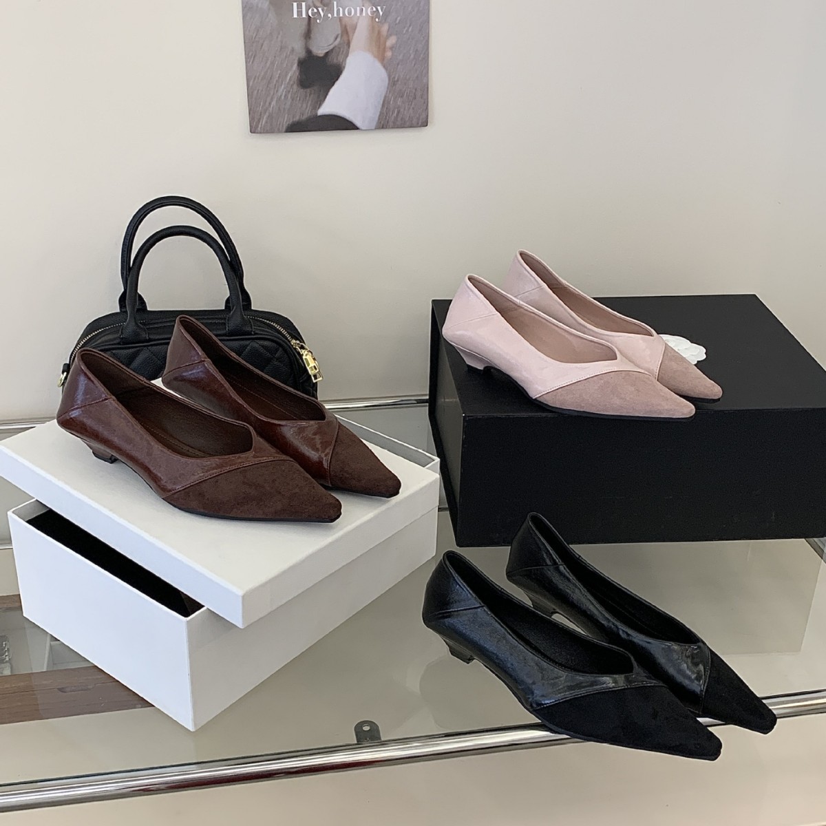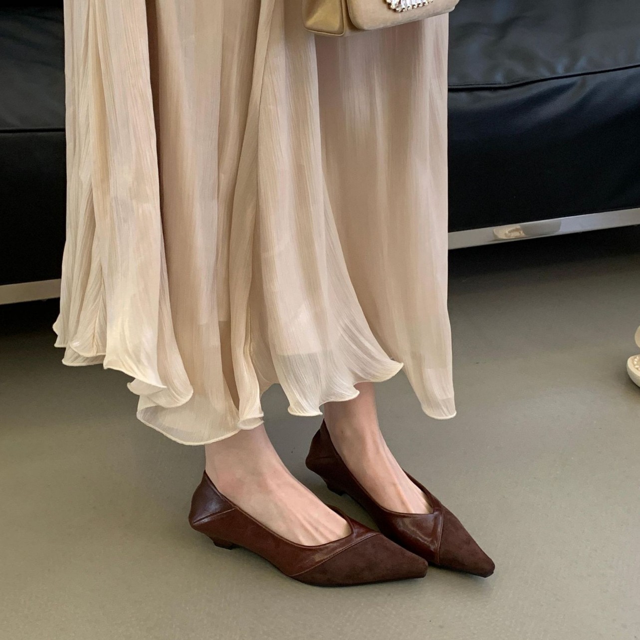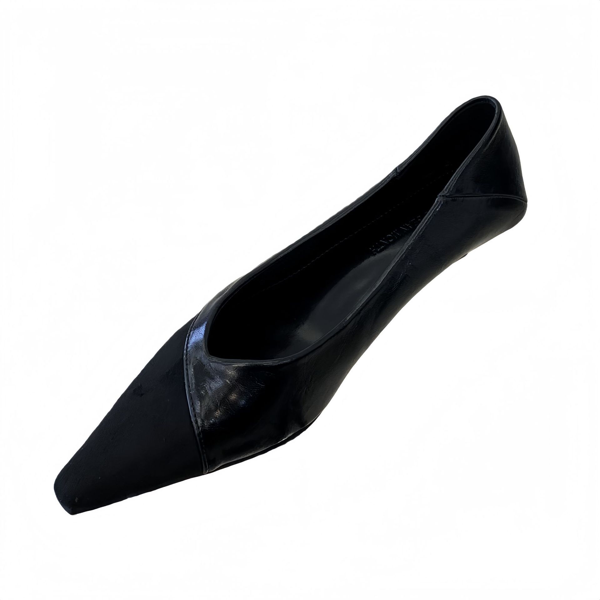 2026春季新款绒面拼接小坡跟浅口尖头单鞋女百搭气质通勤职业瓢鞋