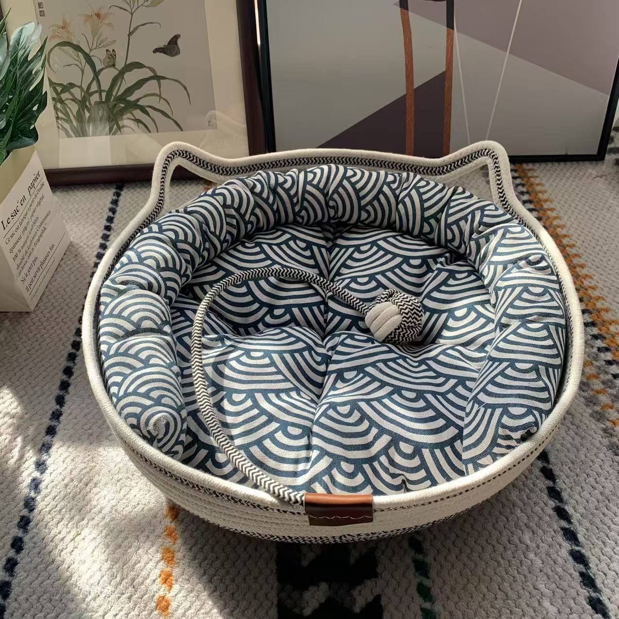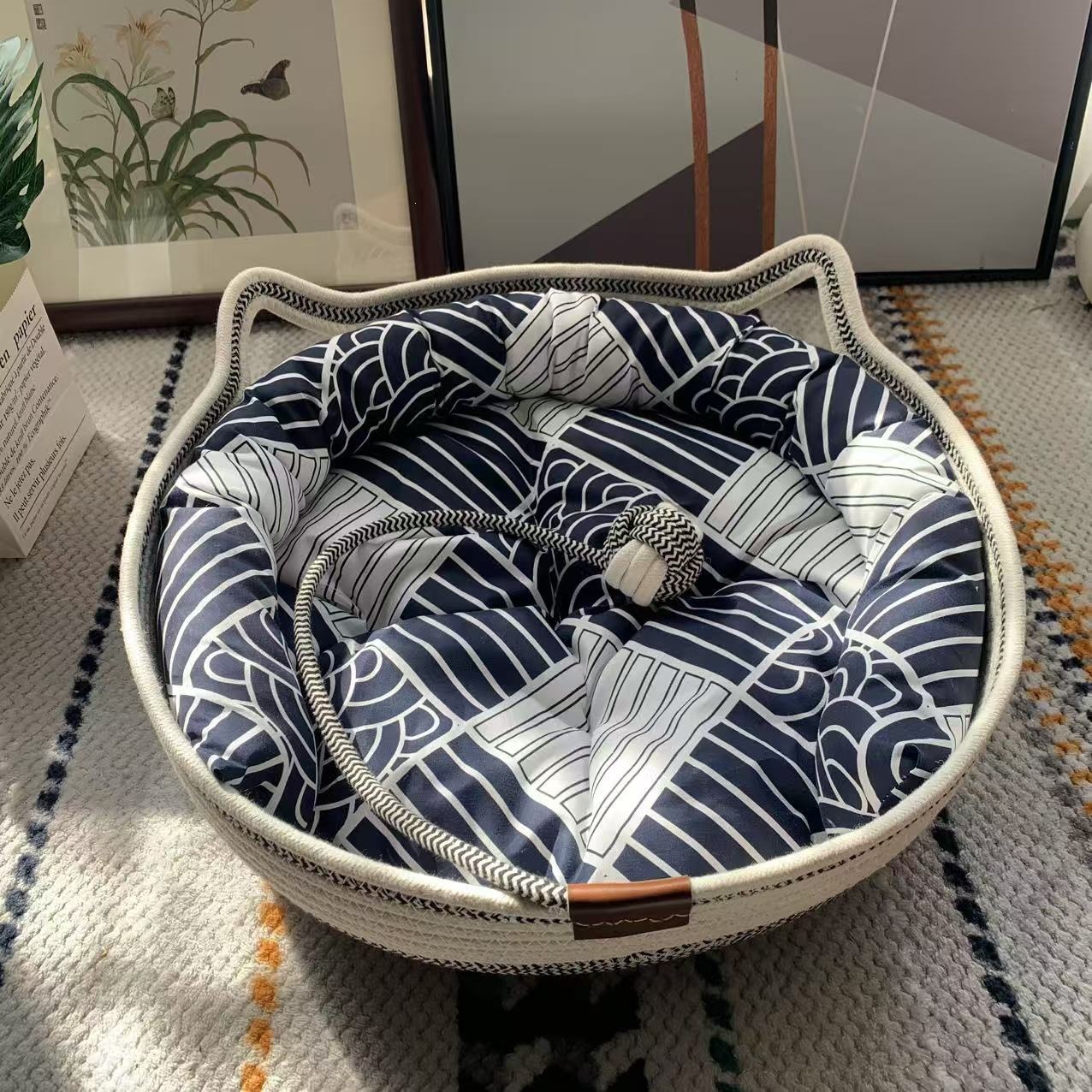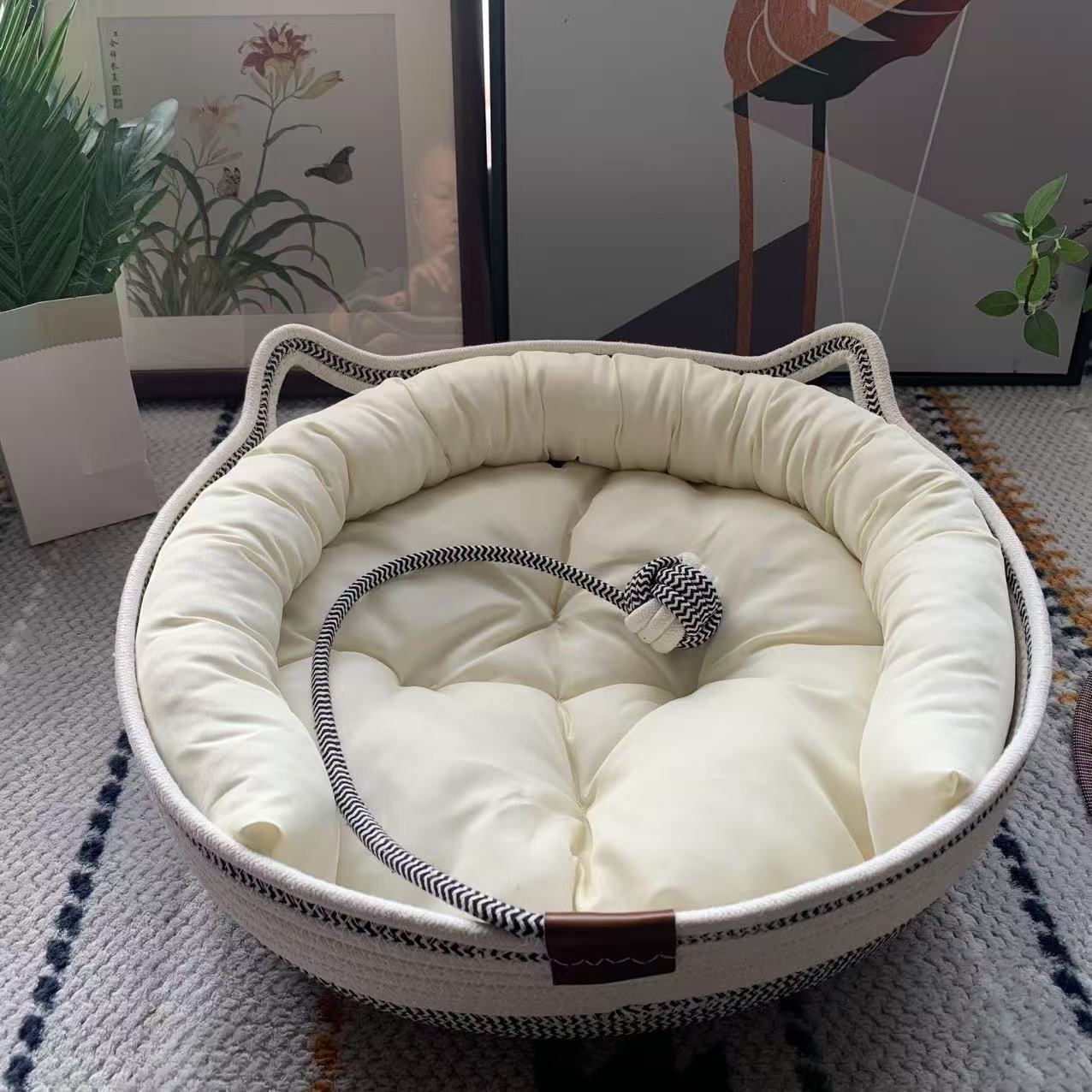 | 是否专利货源 | 否 | 规格 | 黑白双拼猫窝+祥云棉垫+靠枕【送藤席】 |