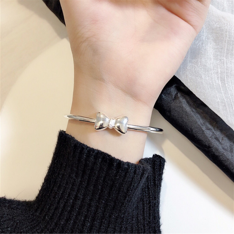 抖音快手直播白铜手镯女简约光面蝴蝶结实心镯子送女友情人节礼物
