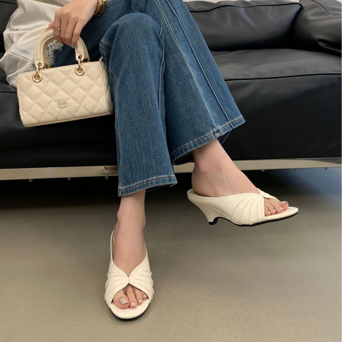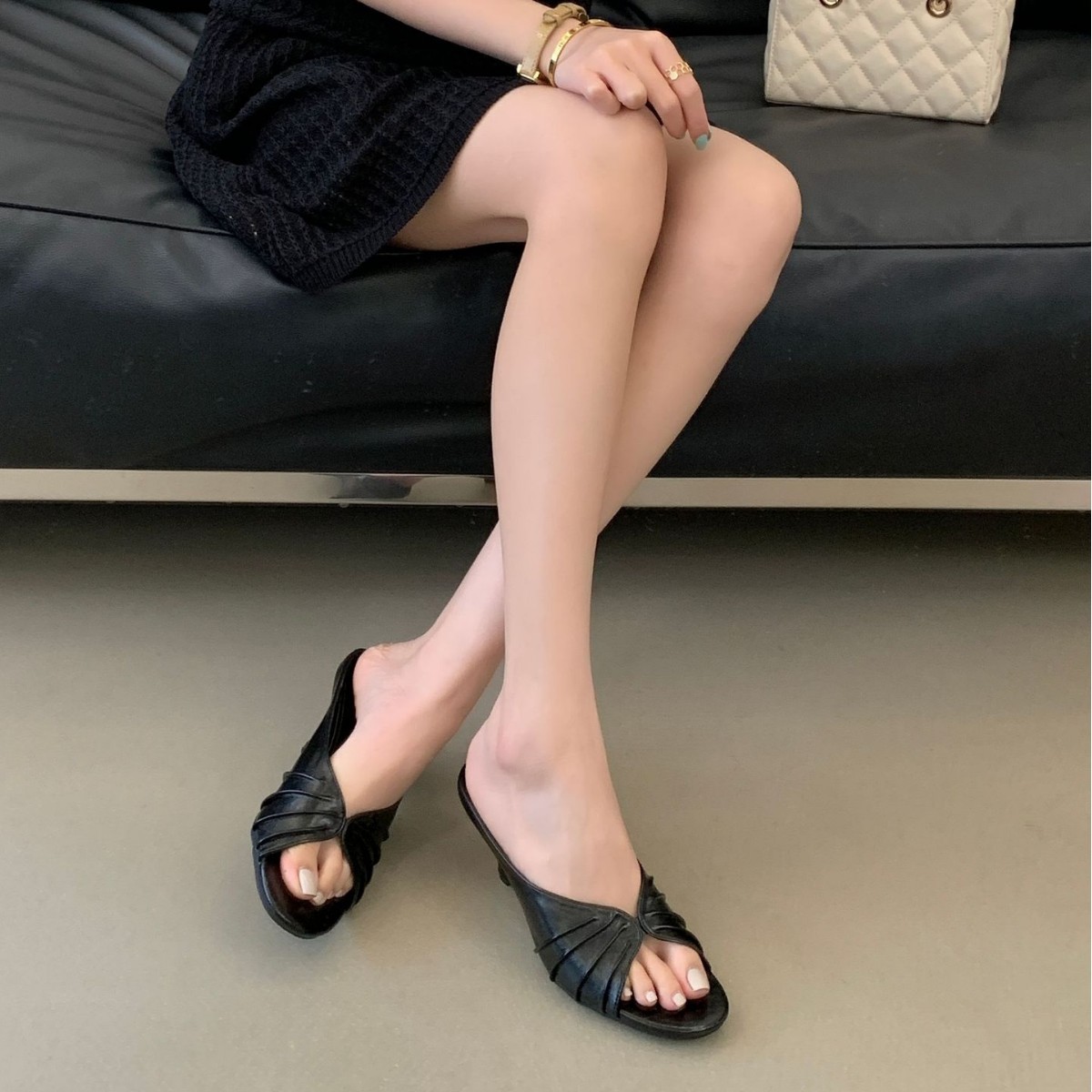 巨显白!高级感皱褶鱼嘴细跟半拖鞋女外穿优雅配裙无敌高跟女凉鞋