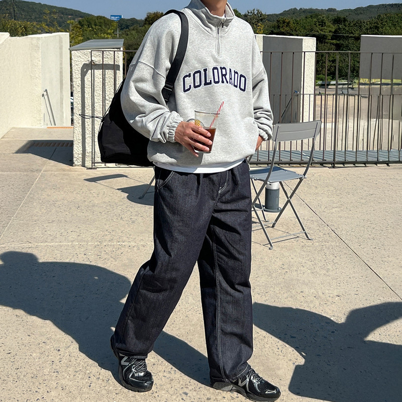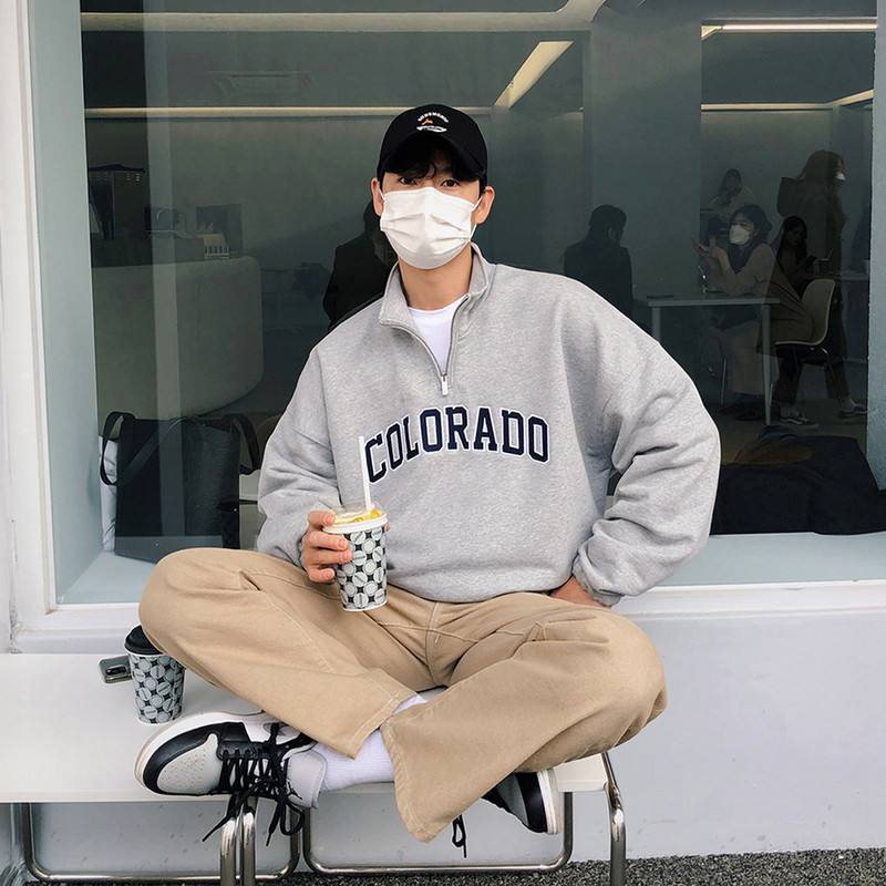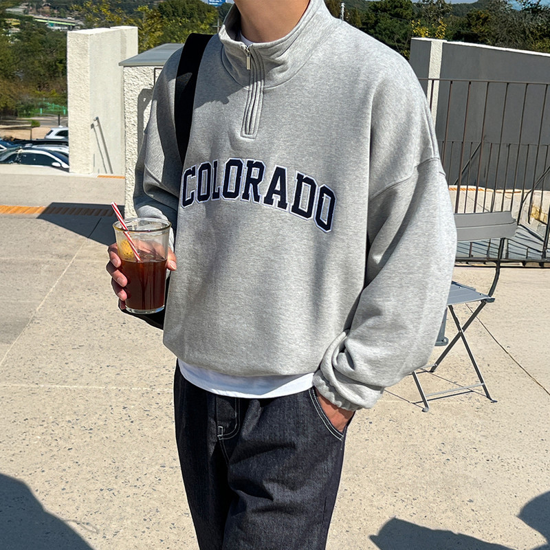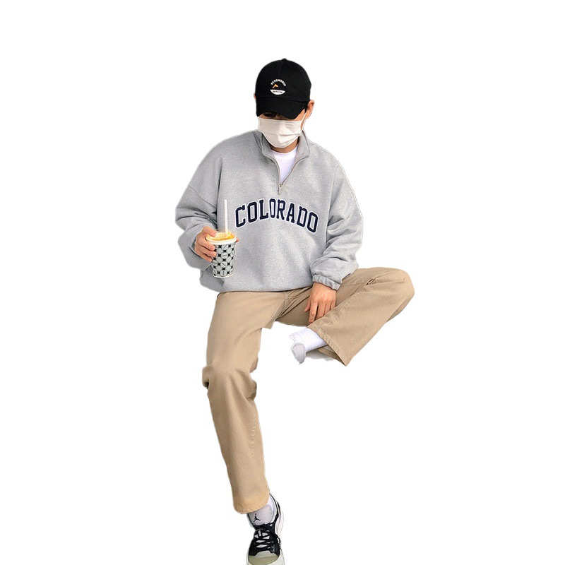 灰色硬挺印花半拉链立领卫衣男春秋宽松百搭套头上衣垂感重磅外套
