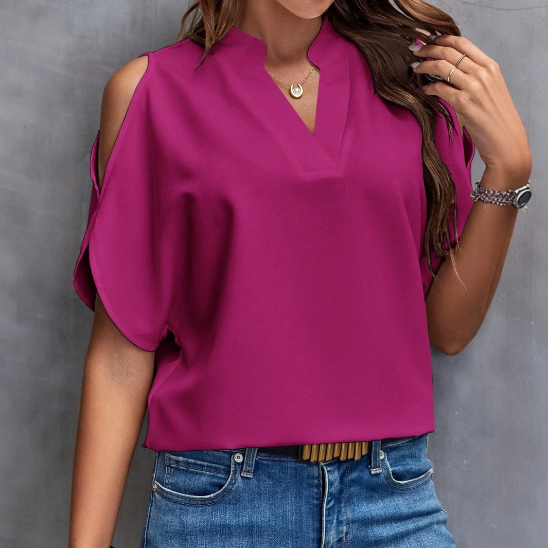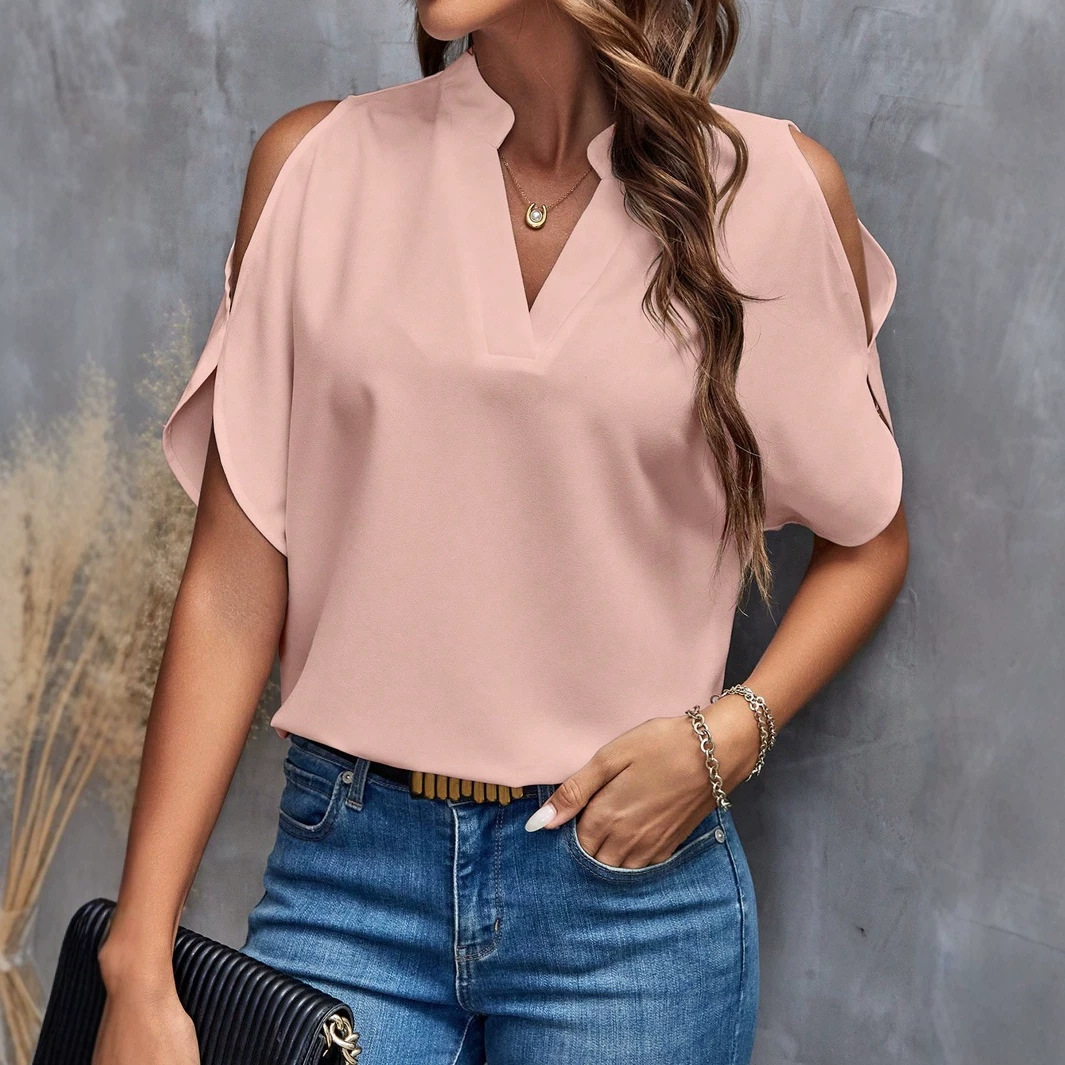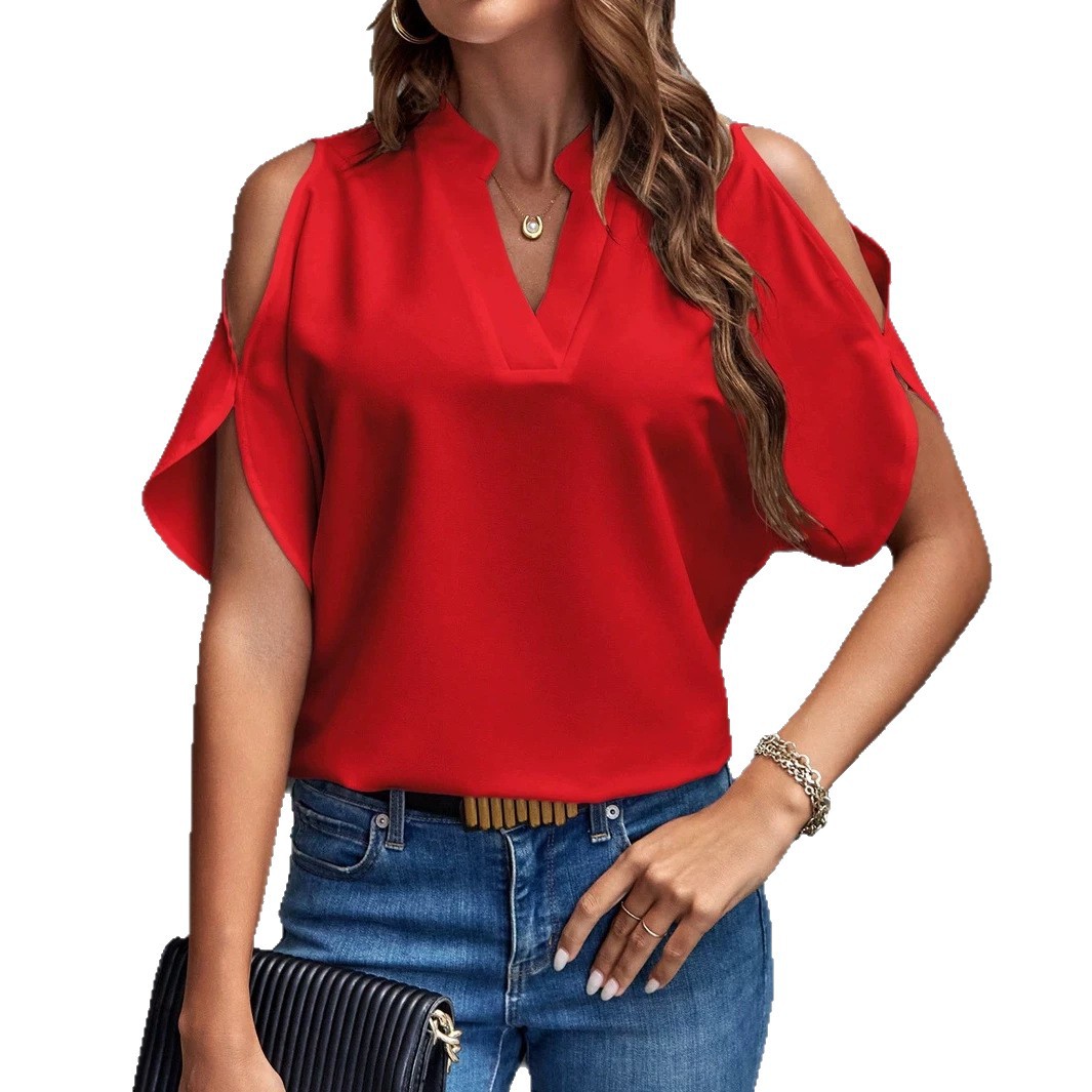 2026亚马逊欧美风性感露肩V领衬衫 夏季宽松遮肉短袖雪纺上衣女